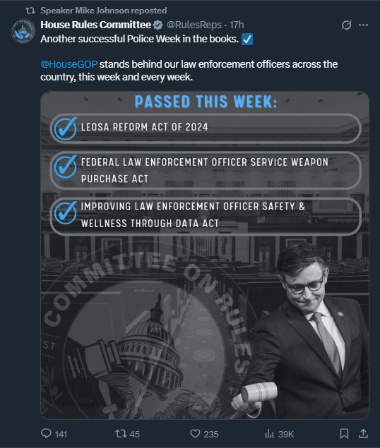 Notes from the Office of Speaker Mike Johnson Hello, friends! Thank you for subscribing to the Office of Speaker Johnson's newsletter highlighting what's happening on Capitol Hill and in Louisiana's 4th Congressional District. | During National Police Week, Speaker Johnson and House Republicans passed multiple bills to protect and support our law enforcement officers, including H.R. 2240, Improving Law Enforcement Officer Safety and Wellness Through Data Act, H.R. 2243, LEOSA Reform Act of 2025, and H.R. 2255, Federal Law Enforcement Officer Service Weapon Purchase Act. | On Tuesday, Speaker Johnson delivered remarks at the House Republican Leadership weekly press conference. He provided an update on President Trump’s One, Big Beautiful Bill, addressed Congressional Democrats' shameful altercation with ICE agents in New Jersey, and exposed Democrat lies about Medicaid. Click the image below to watch his remarks. | In honor of National Police Week, Speaker Johnson hosted a candlelight vigil in the U.S. Capitol on Monday to pay tribute to fallen police officers and commemorate their service to our nation. Speaker Johnson was joined by families of fallen officers and members of the House Republican Conference. Click the photo below to watch his remarks. | On Tuesday morning, Speaker Johnson and members of Congress laid a wreath on the National Law Enforcement Memorial to pay tribute to the 345 officers names who will be added to the memorial this year and to the more than 24,000 who have perished in the line of duty. | Speaker Johnson joined The Record with Greta Van Susteren and FOX News Sunday with Shannon Bream to discuss budget reconciliation and codifying President Trump's agenda. Click the images to watch, and check our YouTube channel for more. | The Record with Greta Van Susteren | FOX News Sunday with Shannon Bream | During National Police Week, Speaker Johnson’s district staff met with law enforcement officials and agencies throughout the district to express appreciation for their service and dedication to the constituents of Louisiana’s Fourth Congressional District. | Speaker Johnson is honored and proud to represent the great people of Louisiana's 4th Congressional District. He is always grateful for your support. Never hesitate to reach out. Thank you for reading, | Office of Speaker Mike Johnson | Sign up for Speaker Johnson's newsletter to get updates from Washington! | Bossier City 2250 Hospital Drive Suite 248 Bossier City, LA 71111 (318) 840-0309 | Washington, D.C. 521 Cannon House Office Building Washington, DC 20515 (202) 225-2777 | Northwestern State University - Ft. Johnson Mailing: P.O. Box 779 Leesville, LA 71496 (337) 423-4232 | DeRidder Mailing: P.O. Box 160 DeRidder, LA 70634 (337) 226-6385 | Ruston 401 N. Trenton St. Ruston, LA 712070 (318) 497-6610 | |