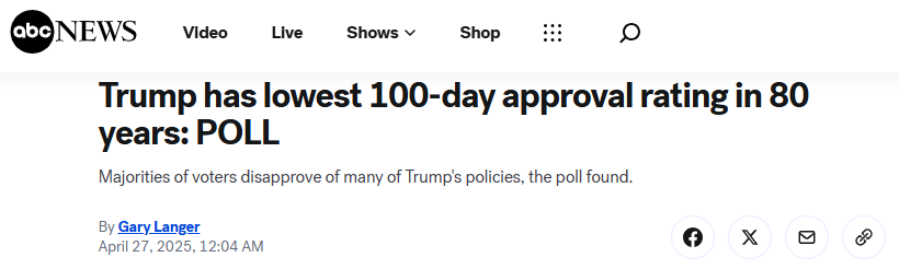 "Donald Trump has the lowest 100-day job approval rating of any president in the past 80 years, with public pushback on many of his policies and extensive economic discontent, including broad fears of a recession, according to a new ABC News/Washington Post/Ipsos poll. [...]