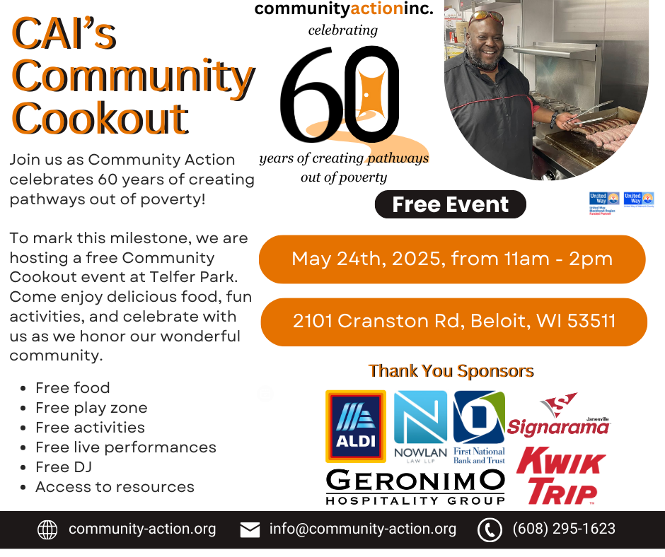 Join us for CAI's Community Cookout on Saturday, May 24th, from 11 AM to 2 PM at Telfer Park! This free event celebrates CAI's 60 years of creating pathways out of poverty in Rock and Walworth counties. Enjoy free food, live performances, a DJ, and special proclamations from Janesville, Beloit, and Delavan. Plus, be inspired by powerful speeches from impactful community leaders and changemakers who have helped shape our mission. |