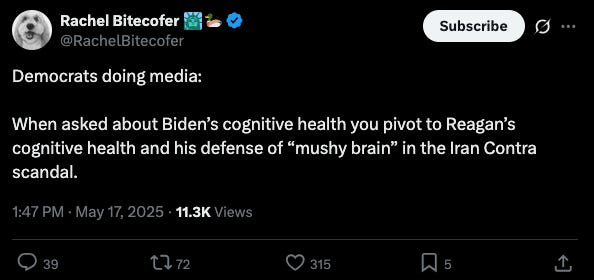 “Truth over lies.” Any political party that claims a monopoly on the truth isn’t a political party at all; it’s a secular religion. And any politician who does so is doing their best to usurp God. Trust me—I come from a country where party and leaders regularly played at both. Many Democratic operatives earnestly believed they were truth-tellers, but no one outside of the DNC echo chamber shares that assessment. The double-whammy of bad Biden news over the weekend was necessary to shock Democrats out of this unrealistic self-image. This is the moment Adam and Eve realize they’re naked. At the intersection of this political meltdown and personal tragedy, there’s a strategic opportunity to turn the tables on Trump. That is, if anyone is willing to take it. The Democrats will have to cast out those who tried to deceive the public over the forty-sixth president’s deterioration. It will require work, because there are those who still can’t read the writing on the retirement home wall. Trump’s lies are bigger, sure, but the lie the Democrats spun was so obvious. And yet one Democratic politico, Rachel Bitecofer, fired off this unhelpful tweet ahead of the Tapper-Thompson book release: MAGA is banking on exactly this response. Rather than go for whataboutism over President Reagan, who left office nearly forty years ago, imagine if top Democrats said the following: