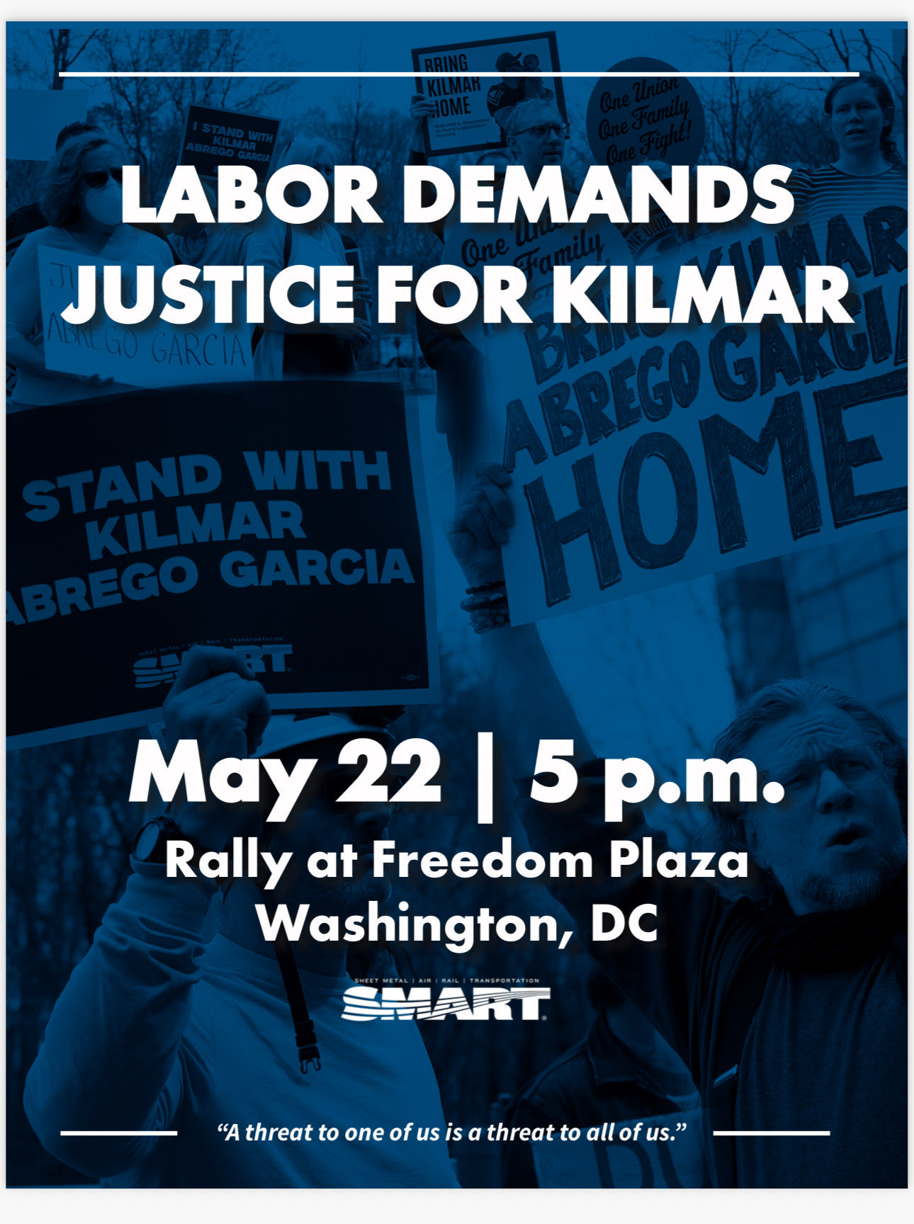 The Trump administration’s disappearance of Kilmar Abrego Garcia to El Salvador is a cruel and unlawful attack on our union brother —and a violation of Kilmar's constitutional right to due process. On Thursday May 22 join SMART 100 and union leaders and workers across the DC region for a rally at Freedom Plaza to demand due process for Kilmar and workers nationwide. More details.