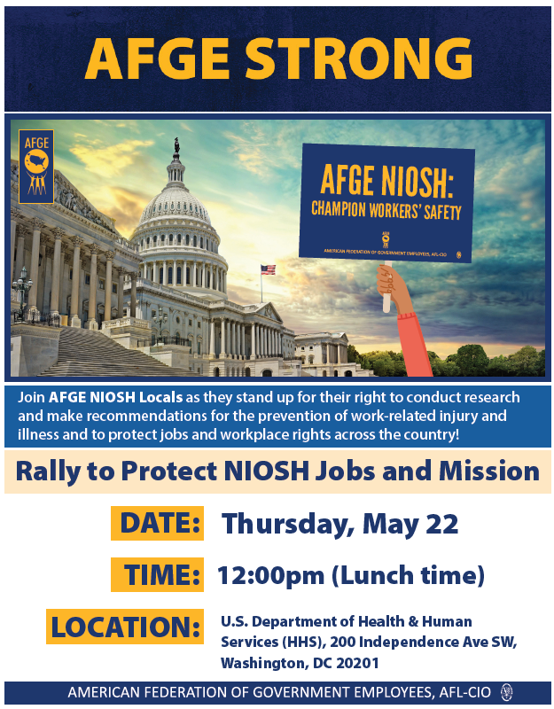 Join AFGE National Institute for Occupational Safety and Health locals to fight for their right to conduct research and make recommendations for the prevention of work-related injury and illness. Rally on Thursday, May 22 from 12-1 PM, and wear you AFGE blue and gold! More details.