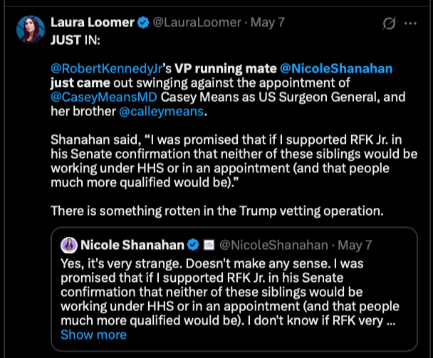 Woke Family TiesFurthermore, Casey Means’s family has embraced woke medical ideology. Her father, Grady Means, wrote Political FalloutIt is also telling that HHS Security Robert F. Kennedy Jr.’s endorsement of Casey Means has drawn sharp criticism from his own allies, including his former 2024 running mate, Nicole Shanahan. Shanahan Casey Means’ lack of medical qualifications—paired with her embrace of woke medical ideology—underscores the Trump administration’s ongoing vetting crisis, which is now plaguing the medical sphere. Dr. Fauci and HHS officials inflicted lasting damage on public trust. Confirming someone as unserious and unqualified as Casey Means risks compounding that harm to national health policy. Unfortunately, this is yet another symptom of a larger vetting crisis. You're currently a free subscriber to LOOMER UNLEASHED. For the full experience, upgrade your subscription. |