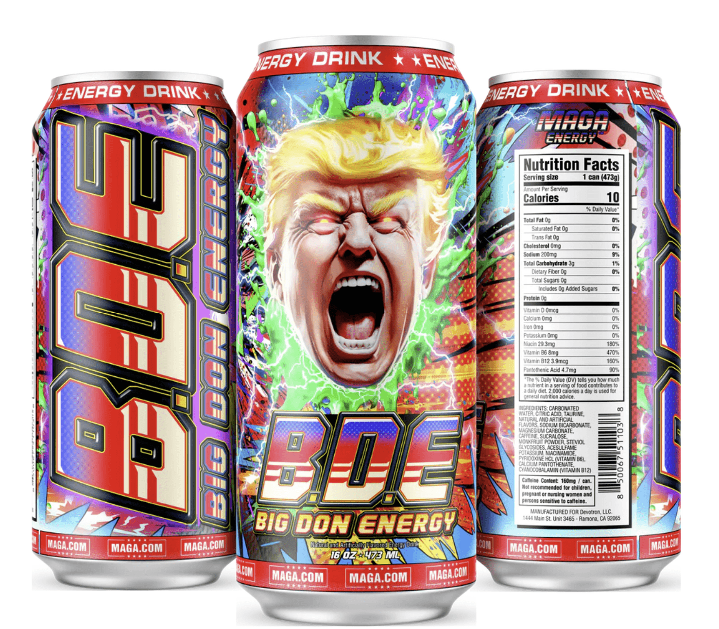 MAGA Energy brings you a powerful drink that’s as bold, unstoppable, and downright unapologetic as Big Don himself. This isn’t your normal energy drink, it’s an all-American surge designed to keep you fired up and locked in! So, crack open a can, fuel up, and remember, when it’s time to win, there’s only one way to do it — BIGLY.