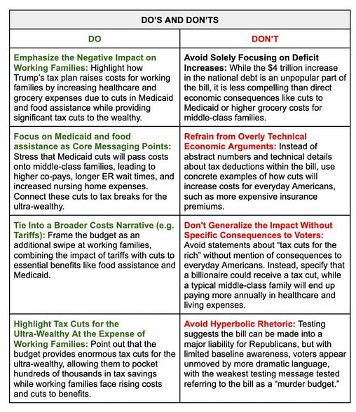 Thank you for subscribing to Off Message. This is a public post, available to all so please share it widely. If you enjoy this newsletter, I hope you’ll consider upgrading to a paid subscription, for access to everything we do. Your support makes Off Message possible. Thank you for subscribing. Try imagining yourself as someone with weak political commitments—someone who doesn’t watch or read much news, but whose fortunes turn pretty heavily on the course of federal policy. Maybe you’re middle class, and soon won’t be able to afford your pre-tariff lifestyle, which is about to cost a few thousand dollars more each year—but you’re only dimly aware that a big price shock is coming, and don’t fully understand why. Or maybe you’re self-employed, and won’t be able to afford your current health plan when ACA premium support falls significantly next year, but nobody’s told you to budget $200 extra each month for insurance. Maybe you’re a little bit poorer than that, a single man who relies on Medicaid, and you don’t realize that the GOP’s top priority is to strip away your coverage. If nothing changes, you’ll pay the price in the near future, but for now, in your blissful ignorance, you whip out your phone to do some scrolling. You happen upon a guy in a suit, trying very hard not to seem bent out of shape. He says, “the GOP budget provides enormous tax cuts for the ultra-wealthy, allowing them to pocket hundreds of thousands in tax savings while working families face rising costs and cuts to benefits.” A few videos later a more normal seeming bloke is livid. “You’re going to lose your health insurance because Donald Trump and all the greedy motherfuckers who hang out at his golf course think you and everyone like you are a bunch of leaches. They’re gonna scheme and lie and break the rules to get this bill passed, pocket all that money, and won’t lose a lick of sleep when it ruins your life.” Which video might get you to call your representatives or march in the streets? Which one did you swipe past the moment you heard the word “budget” or the uncanny phrase “working families”? BLUE BOILERPLATE SPECIALI painted this only-slightly-tendentious picture for two reasons. First, Democratic donors have decided to get in the business of media talent scouting, a development widely characterized and mocked as Dems trying to create a liberal Joe Rogan. Second, Democratic operatives, funded presumably by at least some of the same donors, have weighed in on how congressional Democrats should build public opposition to Trump’s top legislative priority—a bill Republicans muscled through the House Thursday while most of America slept. And their guidance was to be as bland and dispassionate as humanly possible. It was also, specifically, to “Avoid Hyperbolic Rhetoric.” Don’t get too worked up, don’t aim for the lizard brain. For whatever it’s worth, “murder budget” isn’t my idea of good demagoguery, either. It’s not how I talk, and I don’t think it’s how most people talk. Part of the idea should be to rally and persuade simultaneously with genuine, emotionally evocative language. Maybe for some people that’s “murder budget,” but out of my mouth, and out of most Democrats’ mouths, it would sound conspicuously forced, artificially transgressive. You may have noticed a related awkwardness after the election when Democrats in Congress, or the social media staffers who work for them, suddenly started slipping PG-13 swear words into their tweets. But this one phrase is mostly beside the point. The overarching issue is that top Democrats are desperate to prevent members from popping off and showing emotion—even on their best issues—as if the ideal way to reach and activate people is by being as placid as possible. They’re wrong about this, in a way that should be obvious. Many, many senior Democrats, including the party’s leaders, believe that approximately every controversy under the sun is a distraction from the only two issues that matter: health care and tax cuts for the rich. But now that they’re in the fight they want to have, their advisers want them to parry using language that makes them sound like the grown-ups in Peanuts. They’re not going to increase the salience of legislative-budget politics speaking in cliche. To make matters worse, these strategists apparently rigged their test of more aggressive language to ensure that it failed¹, all to settle an intramural score with rivals who want Democrats to fight harder. My hope wading in here is two-fold: First, that Democrats in Congress will not heed this advice and bite their tongues for fear of conveying raw anger—or “hyperbole” if you prefer; second that their affinity for mealy-mouthed garbage doesn’t suffuse parallel efforts to enlarge the Democratic Party’s media footprint. ROG’S GALLERYMost Democrats in Congress can probably remember the long and painful effort to pass the Affordable Care Act, and all the times Republicans nearly killed it. But if you asked them to recall the “strongest-testing messages” from that era, they’d probably be stumped. By contrast, they probably can recall the furor over the “death panels” slander, or that Republicans accused Democrats of throwing granny off a cliff. They might remember that a congressman serving at the time—Alan Grayson—described the Republican health-care plan like so: “Don’t get sick. And if you do get sick, die quickly.” I’m not sure any of those messages were ever formally tested, but if they were, they would have tested poorly; Democratic consultants would have run the Grayson line through a focus group and discouraged Democrats from ever repeating it. But Grayson’s approach was plainly, obviously more galvanizing than any message that includes the phrase “working families.” Nobody normal ever uses those two words together the way Democrats do, and when normal peo