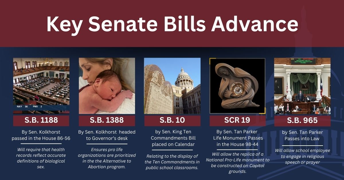 - SB 1188 by Senator Lois Kolkhorst passed in the Texas House 86-56 which will require that health records reflect accurate definitions of biological sex.