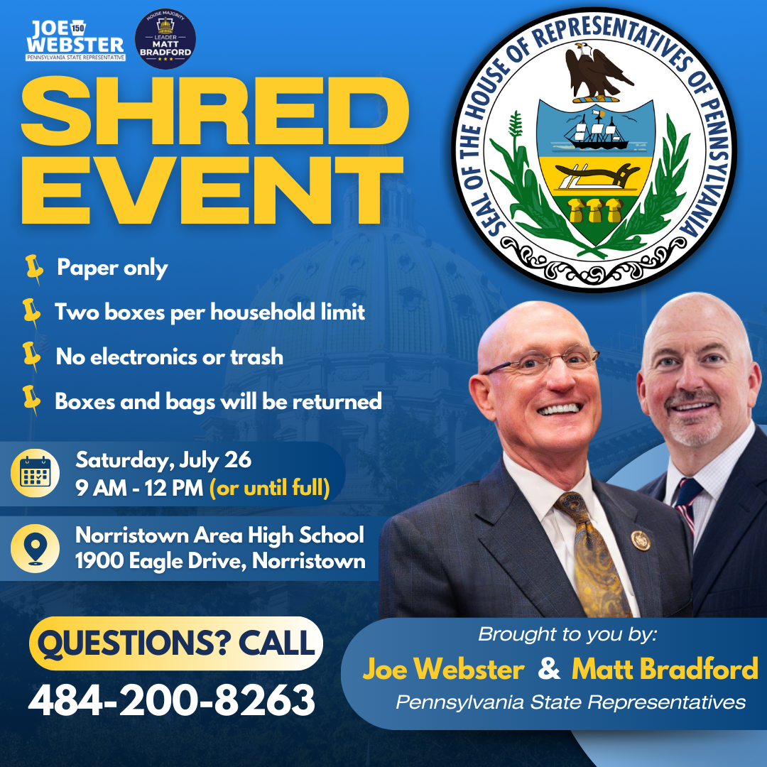 Dear Neighbor, I hope you are well. This week, I have information on my Shred Event with Representative Matt Bradford in July, a recap of weekend events including the Collegeville-Trappe Memorial Day parade and West Norriton Community Day, the Perkiomen Mapping & Flood Mitigation Study Public Meeting and more! As always, I hope you find the information below useful. | Save the date! I’m partnering with Rep. Matt Bradford to host our annual Shred Event on Saturday, July 26, at Norristown Area High School from 9 a.m. to 12 p.m. (or until the trucks are full). This is a paper-only shred event with a limit of two boxes per household. No electronics or trash are permitted, and any boxes or bags will be returned to you after materials are shredded. If you have any questions, please reach out to my office at 484-200-8263. | On Monday, I had the opportunity to give remarks and walk alongside fellow veterans in the Collegeville-Trappe Memorial Day parade. Thank you to Collegeville Borough and Trappe Borough for hosting this parade to honor and remember those who gave their lives in service to our country. | | West Norriton Community Day | West Norriton Community Day was a hit! On Sunday, my staff spoke with constituents, shared valuable resources and explained how our office can help you! Thanks again to West Norriton Township for hosting this event for our community! | | Paul Miller’s Law Effective June 5 | Friends, I’m sending you a reminder that Paul Miller’s Law, which makes it illegal to use a hand-held device while driving, goes into effect on June 5. Whether you’re driving, stopped temporarily by traffic, waiting at a red light or any other delay, law enforcement will start issuing written warnings for any violators on June 5 and summary citations on June 6. Please stay safe on the roads and put down your phone while driving – the text can wait. For more information, you can visit this website. | | Perkiomen Mapping & Flood Mitigation Study Public Meeting | Coming up on Wednesday, June 18, the Perkiomen Mapping & Flood Mitigation will host two virtual public meetings to share preliminary results, recommendations, and review study objectives. You can sign up using the following links: Meeting 1: 3 p.m. to 4:30 p.m. Register: https://tinyurl.com/PerkyMeeting1 Meeting 2: 7 p.m. to 8:30 p.m. Register: https://tinyurl.com/PerkyMeeting2 The Perkiomen Mapping & Flood Mitigation Study is a collaboration between county planning commissions and conservation districts, local municipalities, the Perkiomen Watershed Conservancy, my office, and other organizations to help address flooding issues throughout the entire Perkiomen Creek watershed which includes Montgomery, Bucks, Berks, and Lehigh Counties. For more information, please visit www.perkiomenwatershed.org. | If you are unable to make it to my district office for assistance, we also offer mobile office hours at the Upper Providence Township Office Wed., June 4, and the West Norriton Township Building on Wed., June 11 from 10 a.m. to 12 p.m. Stop by and my staff can assist you with any state-related issues! | Last week we highlighted National Safe Boating Week, but safe boating procedures extend well beyond just a week of recognition. No matter when or where, it’s important to stay safe when you’re out on the water, especially since our area has several waterways. Please check out the video for a few easy steps to follow this spring and summer! | | School Bus Driver Unemployment Information | If you’re a school bus driver and your hours drop during summer break, please take a look at this website from the PA Dept. of Labor & Industry for unemployment compensation information and resources. | | Construction Alert: Bridge Replacement on Black Rock Road | Heads up! PennDOT announced that construction to replace the bridge on Black Rock Road that passes over Crossmans Run in Upper Providence Township started on May 12. The section of Black Rock Road between Upper Indian Head Road and Ashenfelter Road will be closed through Monday, December 1. PennDOT is advising drivers to prepare for delays and use Egypt Road and Route 29 during construction. | | How to Contact Your Federal Representatives | Remember to maintain federal accountability and express your concerns and questions with your federal officials in the House, Senate, and White House. Let them know you are paying attention to what they are and aren't doing to protect your interests. Also, ensure your state representatives are informed too. | If you need state-related assistance, my office can help you. Check out the graphic for ways we can help or call with any questions at 484-200-8263. | Walk a Mile in Her Shoes from Ursinus College & Laurel House Saturday, May 31, at 9 a.m. Ursinus College, Floy Lewis Bakes Center, 600 Main Street, Collegeville, PA Wildlife Walk Around from Upper Schuylkill Valley Park Saturday, May 31, at 1 p.m. 1615 Black Rock Road, Royersford, PA PVHS Art & Food Truck Festival from Perkiomen Valley High School Saturday, May 31, from 11 a.m. to 3 p.m. 509 Gravel Pike, Collegeville, PA Frank H Martin III Memorial Car & Truck Show from Trappe VFW Friday, June 6, at 5 p.m. 201 W. 3rd Ave, Trappe, PA Summer Concerts in the Park: Highway Run from Lower Providence Township Sunday, June 8, at 6 p.m. Eagleville Park, 100 Parklane Drive, Norristown, PA | Please continue to stay safe, healthy, and well-informed. And, if you have questions about any state-related issue, please contact my office at 484-200-8263 or email [email protected]. If you wish to unsubscribe to this email, please scroll to the bottom where it says, “visit this page to manage your email preferences." Sincerely, Rep. Joe Webster State Representative 150th Legislative District | Pennsylvania State Capitol 125-B East Wing P.O. Box 202150 Harrisburg, PA 17120 (717) 787-0419 | District Office 35 Evansburg Road Collegeville, PA 19426 (484) 200-8258 | |