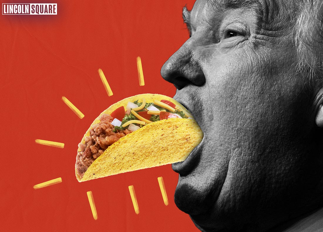 Thank you for being a free subscriber.. For all-access to Lincoln Square, and to help us amplify the content that you’re reading to Americans who aren’t paying attention, please consider upgrading your subscription today with this limited-time offer: TACO Don: Why a Seemingly Silly Insult Hits Donald Trump Where It HurtsThe nickname may be goofy, but it's oh so meme-worthy. And that's worth a lot.Among all the barbs hurled at Donald Trump over the years — from the devastatingly clinical takedowns by career prosecutors to the meme-worthy Twitter dunks — few insults have had the sheer, inexplicable sting of being called “TACO.” “Trump Always Chickens Out.” Penned by Wall Street wags tired of his trade war pump-and-dump behavior, the so-called Masters of the Universe finally understand that Trump’s trade war is like Trump himself: stochastic boasting, deep-vein chaos, juvenile bluster backed up by … nothing. It’s short, sharp, silly on its face — but beneath that shell is a devastating payload. Like so many things with Trump, the humor strikes a deeper, raw nerve. The insult enrages him not because it’s the cruelest or cleverest, but because it’s the most diminishing. And Donald Trump cannot survive being made small. You could see it today when a reporter asked him about it — his slow, bovine mind registering the insult gradually, but deeply. His snippish responses belied his rage. As an anthropologist of this hideous creature, one of my perverse delights is watching him try to hide that rage as his spun-sugar ego takes a hit. Having delivered many such hits myself, I like to call it an allowable cruelty. At the core of Trump’s psychological infrastructure is a pathological obsession with dominance. His entire public persona is built like one of his gimcrack Atlantic City casinos: gaudy gold trim, carpet the color of a three-day bruise, faux marble, and fake tits in abundance. The constant hum and ding of slot machines promising WINNING. He doesn’t merely want to be respected. He wants to be feared, idolized, mythologized. Anything less is a personal affront. To be called “TACO” — a word that evokes, not unfairly, both the reality of his utterly botched trade war fiasco and something messy, cheap, handheld, and delightfully common — is to jab a shiv directly into the myth of Trump the Colossus... Continue reading this post for free in the Substack app |