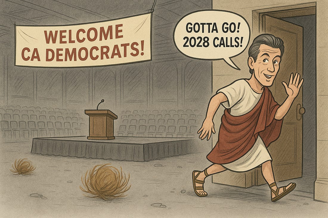 The question is pretty simple… So, does it matter?California’s Democrats Bet on Radicalism, Not Results at Anaheim ConventionNewsom Skips Left Wing Confab, Eyes 2028 Presidential RunThe California Democratic Party’s 2025 State Convention in Anaheim, drawing thousands of activists, was a chaotic showcase of a radical liberal agenda that ignored California’s deepening crises. Held in Orange County—once a conservative bastion, now a purple area—the “CA Strong” convention, marked by heated clashes and finger-pointing, revealed a party enthralled by its activist base. Speakers such as Minnesota Governor and former 2024 Democratic Vice-Presidential nominee Tim Walz, New Jersey Senator Cory Booker, California Senator Adam Schiff, and Long Beach Congressman Robert Garcia energized delegates. In contrast, Governor Gavin Newsom and Former Vice President Kamala Harris skipped the event, signaling their detachment from the party convention’s unbridled ultra-liberal delegates. Governor Walz, whose 2024 campaign equated ICE with the Gestapo, championed progressive values like protecting vulnerable communities but warned Democrats they risk becoming “roadkill” without reconnecting with working-class voters. Senator Booker’s call for “good trouble” rallied activists but glossed over California’s housing affordability crisis. Senator Schiff’s pledge to “stand up for every Californian” rang hollow amid soaring costs, while Congressman Garcia backed climate mandates that burden families with regulations. Former Vice President Harris, absent but appearing via a lackluster video to criticize Republican policies, left delegates split on her 2026 gubernatorial bid, according to The New York Times. The CDP passed a bunch of meaningless resolutions on issues, pandering to the party’s liberal base while sidestepping the state’s crumbling infrastructure, failing schools, and business exodus to states like Texas. Gubernatorial hopefuls, including California Senate President Toni Atkins, Attorney General Xavier Becerra, Former Congresswoman Katie Porter, and Former Los Angeles Mayor Antonio Villaraigosa, courted delegates. Yet, the party doubled down on climate bonds and criminal justice reform rather than focusing on practical solutions. California’s crises tell the story: homelessness has surged despite billions spent, $24 billion in unemployment fraud exposed incompetence, the $128 billion bullet train remains a boondoggle, and reported $9.3 billion in healthcare costs for illegal immigrants strains budgets. Failing schools churn out unprepared students, while high gas prices and regulations drive businesses away. Governor Newsom’s absence, sending only a letter while attending a Democratic Governors Association meeting (a mere two-hour flight away in Portland), suggests he’s now focused on the national stage. Former Vice President Harris’s uninspired video failed to unify delegates, with some favoring Porter or others for 2026. The convention’s combative tone and progressive dogma—ignoring voters’ pleas for lower taxes, safer streets, and affordable homes—alienated working families. The convention’s extreme liberal agenda ignored California’s dire challenges: rampant homelessness, unaffordable housing, rising crime, businesses fleeing to freer states, and crumbling infrastructure from potholed roads to failing power grids. The CDP’s focus on progressive dogma over lower taxes, safer streets, and economic relief alienated working families. California faces a multitude of problems, nearly all of which are fueled by decades of ideological left-wing policies from Sacramento that have saddled the state with policies and circumstances that significantly diminish the quality of life of all Californians. So, Does It Matter? - with Jon Fleischman is free today. But if you enjoyed this post, you can tell Jon that his writing is valuable by pledging a future subscription. You won't be charged unless he enables payments. |