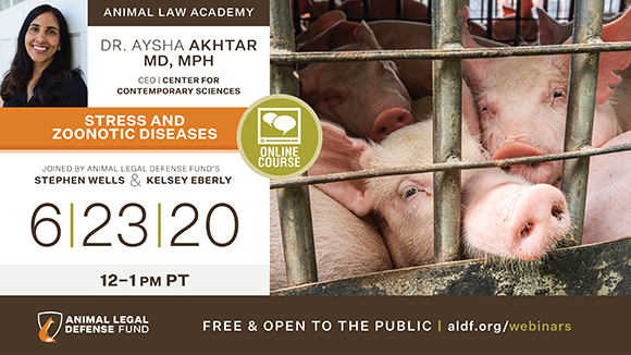 Please join public health expert Dr. Aysha Akhtar, Animal Legal Defense Fund Executive Director Stephen Wells, and Animal Legal Defense Fund Staff Attorney Kelsey Eberly for Stress and Zoonotic Diseases, a round table discussion about the impacts of stress and confinement on disease transmission between animals -- and conditions where they are most likely to jump to humans.