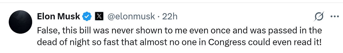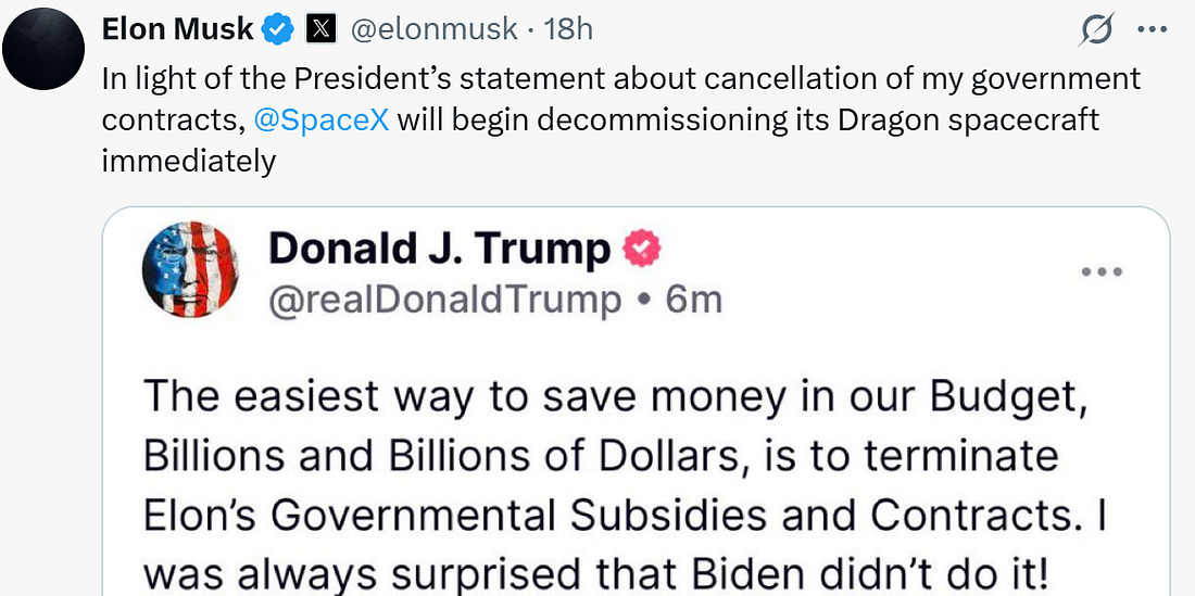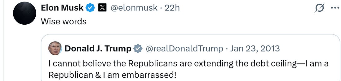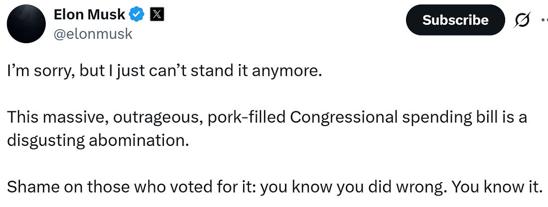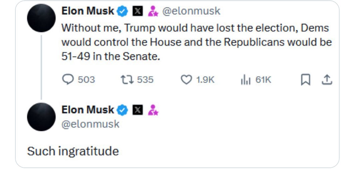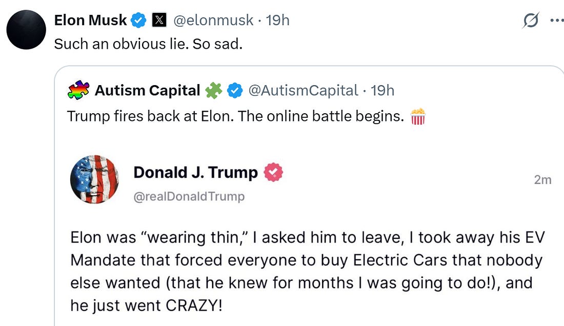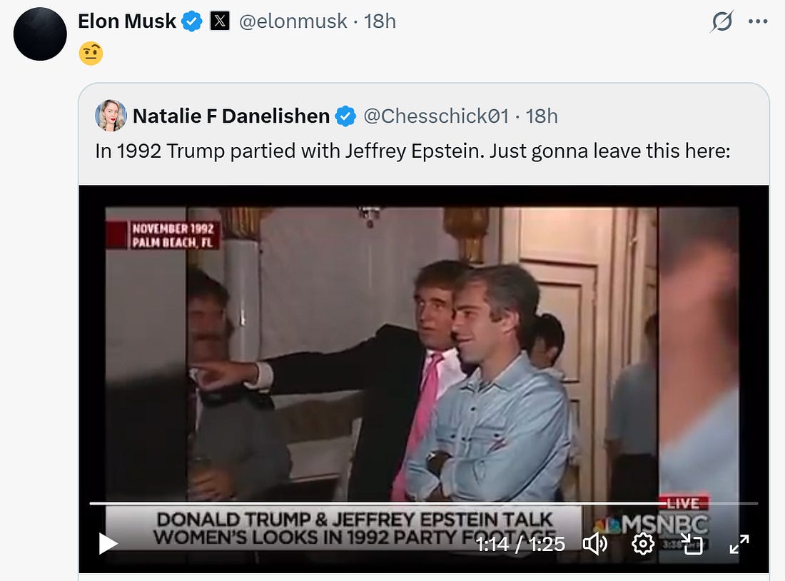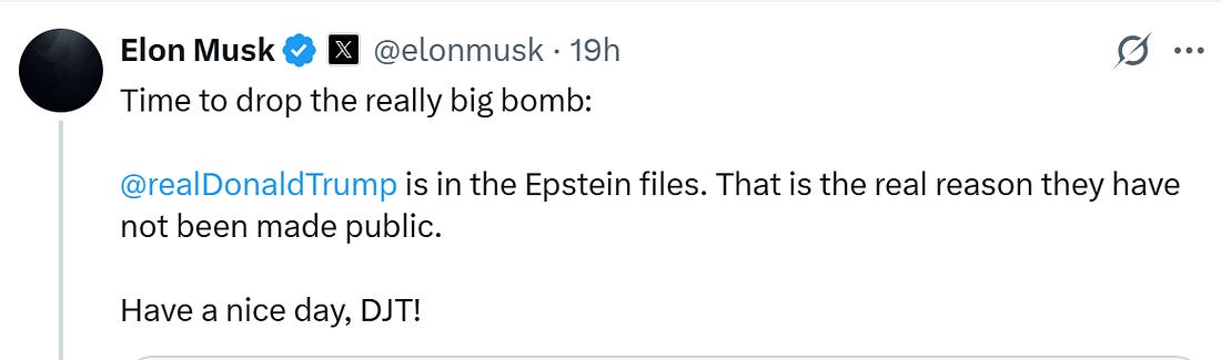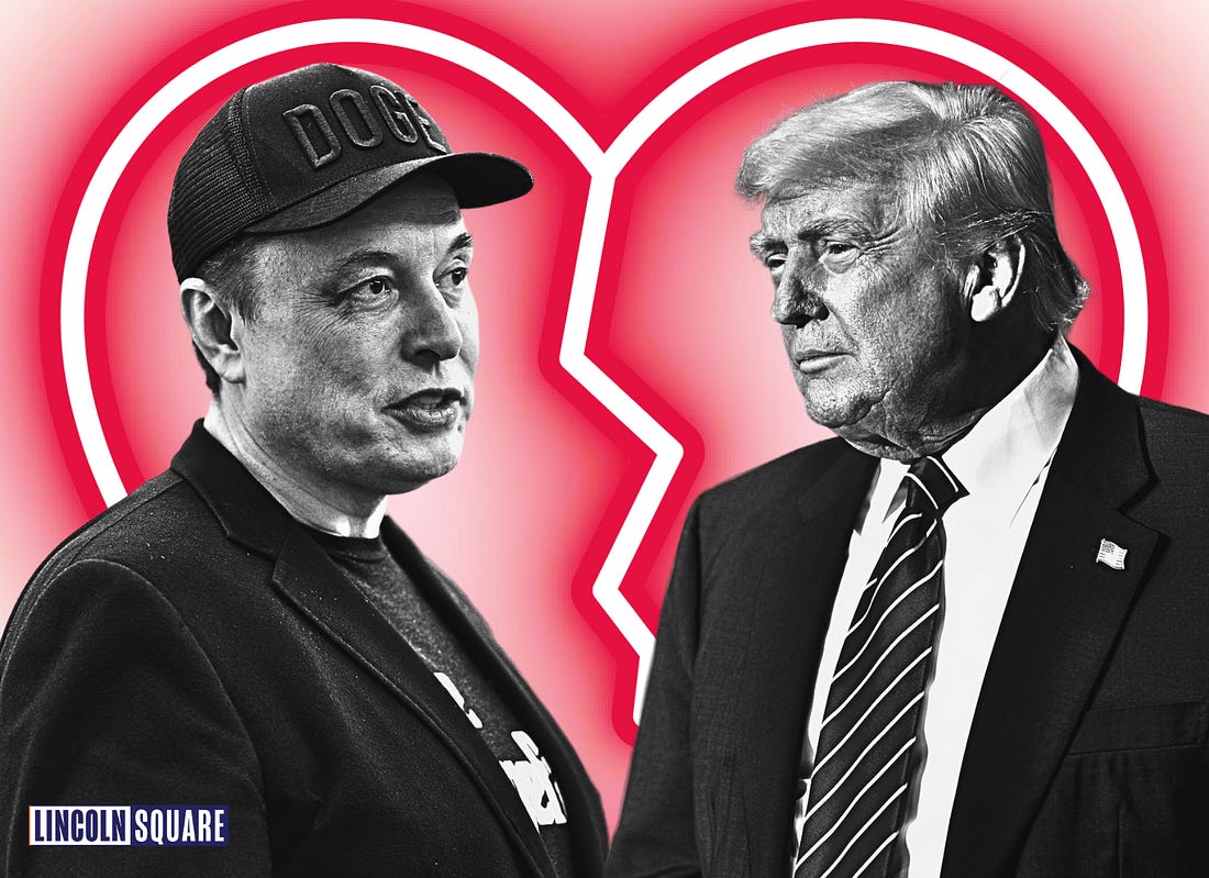 Thank you for being a free subscriber.. For all-access to Lincoln Square, and to help us amplify the content that you’re reading to Americans who aren’t paying attention, please consider upgrading your subscription today with this limited-time offer: Hurry! offer ends soon! Everyone wants to be loved, but it’s hard to put yourself out there. And breakups can get messy, especially when you try and post through it on social media. This week, Autocracy’s It Couple, Don and Elon, called it quits — and in spectacular fashion. Here’s a timeline of their romance gone wrong: Friday, May 30, 2025: Trump gifts Elon Musk a gold White House key for his “service” as a special government employee. The key opens nothing, but the symbolism screams, “America is for sale.” Tuesday, June 3, 2025: Musk can’t hold back his thoughts on Trump’s budget bill, and starts the storm: Wednesday, June 4, 2025: Musk starts a barrage of tweets about his big feelings about the bill. Thursday, June 5, 2025: Musk is probably up all night, stewing about it all … 12:00 PM: Musk reposts old tweets from Trump that show his “Big Beautiful Bill” conflicts with the President’s statements in the past about raising the debt ceiling. 2:00 PM: Musk amps it up and tweets that Trump would’ve lost the election if it weren’t for his help and money. He says Trump is ungrateful. 3:00 PM: Trump responds in an Oval Office meeting that would’ve won anyways. He says Musk had a lot of time to read the bill and accuses him of being salty that EV mandates were left out, being “hostile” and having “Trump Derangement Syndrome.” Musk retorts: 3:30 PM: Trump says that Elon Musk was “wearing thin” and “went CRAZY!” 4:00 PM: Musk claps back with a low blow and reposts a video of Trump & Jeffrey Epstein partying down together. Trump responds on Truth Social, and threatens to terminate Musk’s government subsidies. Musk responds with a threat of his own: Then Elon retweets a post calling for the impeachment of Trump: 4:30 PM: Trump says that he doesn’t know if he and Musk will have a relationship anymore. Now we’re all left wondering … who gets the kids in the divorce? You’re currently a free subscriber to Lincoln Square Media. For full access to our content, our Lincoln Loyal community, and to help us amplify the facts about the assault on our rights and freedoms, please consider upgrading your subscription today with this limited-time offer: |