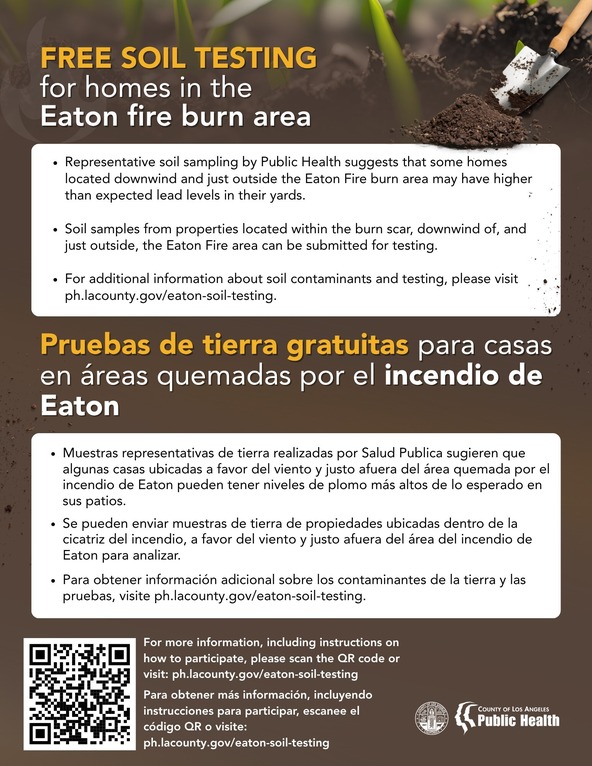 As noted above, the Department of Public Health also has a new FREE soil lead testing program for residents living downwind of the Eaton Fire burn area.
