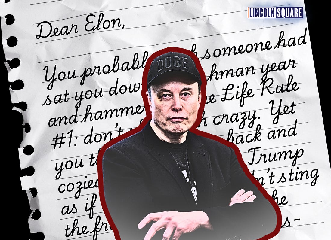Thank you for being a free subscriber.. For all-access to Lincoln Square, and to help us amplify the content that you’re reading to Americans who aren’t paying attention, please consider upgrading your subscription today with this limited-time offer: An Open Letter to ElonThe richest man in the world holds enormous power. Is he smart enough to wield it against Donald Trump?Elon, my man, let’s chat. Long-form, no bullet points, no safety rails. You probably wish someone had sat you down in freshman year and hammered home Life Rule #1: Don’t sleep with crazy. Yet you threw the covers back and cozied up to Donald J. Trump as if the scorpion wouldn’t sting the frog halfway across the river. You figured the transaction was linear: You elected him, then you’d get the power, contracts, influence, all the tidy perks of being court technologist to a tin-pot monarch. What you forgot is the law of political thermodynamics: Everything Trump touches dies. Even for the guy who can park reusable rockets on a postage stamp, that law still holds. Here’s the storm you’re sailing into. Yes, the Pentagon’s space program rides on the back of your Falcons, and Starship will someday heave half of Texas into orbit, but Trump, ever the vengeful landlord, doesn’t care. It doesn’t matter if ULA and Blue Origin literally don’t have the rockets for it, your contracts are toast. Facts don’t matter in MAGA-land; only fealty does. You’re discovering that in real time. Expect his FAA to start slowing down Starship permits. Missing Biden yet? Then there’s your drive-by flirtation with a third political party. On paper, launching one is like climbing Everest in house slippers, but you’re the only mortal who can lubricate that death march with unlimited cash. The mere threat of siphoning ten percent of the red-hat vote in Arizona or Georgia has LaCivita and Tony the Pollster sweating through the upholstery. (In fairness, that’s not uncommon for them.) And don’t underestimate the appeal: your Silicon Valley bros — futurists high on transhumanism and effective altruism — would ditch the boat-parade crowd for a “Singularity Party” before you could tweet “Neuralink.” Imagine selling policy to Neuralink and Cybertruck fanboys instead of dudes with Bass Pro visors and erectile dysfunction. ... Subscribe to Lincoln Square Media to unlock the rest.Become a paying subscriber of Lincoln Square Media to get access to this post and other subscriber-only content. A subscription gets you: