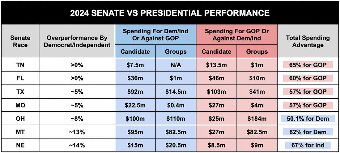 When Did I Know I Was Going to Lose?The moment I knew Democrats were really in trouble and how to avoid it in 2026In the midst of the current chaos, and staring down some of the worst legislation in history, it’s more important than ever to look back at the last election for some clues as to what happened. After all, this messy Trump-Musk coalition that we are watching break up was always messy, and the pro-corporate pro-billionaire legislation is basically just what they always promised to do. And we still lost to them. We can’t let that happen again. Sometimes, people ask me at what point I knew I was going to lose my senate election against Josh Hawley. I remember the exact moment, so today I’ll tell you about it along with some insight into why that was the moment of realization for me (this will include information on why polling is so all over the place). Even more importantly, I’ll talk about an earlier moment in the campaign when I knew Democrats as a whole were in trouble, and how we can avoid the mistakes of the past going forward. Before I dive in, I just want to say thank you for everyone who follows this substack and especially everyone who shares it and supports financially. It’s very difficult financially for a normal person to run in these elections like I did (back to back) and your willingness to support those of us who put it all on the line is the only way we can continue to do it. Obviously, my election was an uphill battle. My home state is red and Donald Trump was on the ticket. But I always believed I had a chance to win. The incumbent was uniquely unpopular and unlikeable in a way that we knew we would outperform the top of the ticket. We just didn’t know by how much for two reasons: (1) we didn’t know what the money would look like and (2) Trump voters overwhelmingly wanted a Trump ally in the Senate, so we needed a good national year for Democrats if we didn’t have the money advantage. The money was important because, as you can see below, Democrats overperforming the presidential ticket in red states directly correlates to the D:R spending ratio. Yes, your donations really do make a difference. Unfortunately, by the end of October it became clear that Josh and his Super PAC would be able to spend significantly more money than us. We were outspent on the airwaves, and we were only able to compete in four of Missouri’s ten media markets. We knew early on that with a spending advantage we could outperform the top of the ticket by between 10 and 15%, depending on the size of that spending advantage. Even without that, we knew that, since the incumbent was weak, we could outperform the top of the ticket by 4-10% on just the strength, rather than the volume, of my message. So we could still win depending on the performance of the national ticket. I held out hope through election night that Harris could keep it closer than she did. One of the reasons we were still hopeful until election night has to do with polling. Polling isn’t as random as people think it is. What happens in Missouri, where people don’t register by party, is that pollsters call a bunch of people, who then self-report as independent, Republican, Democrat, Trump-Voter, Kamala-Voter, whatever the pollster asks. Then they ask them the poll questions. Once they have all the raw data, the pollster “balances” the poll. This means that they estimate what percentage of the electorate will be D/R/Ind, or what percentage will be Trump/Kamala, and use that as an anchor point for all of the down-ballot races. So, for example, if they used the Cook report rating benchmark of Missouri being a +11 Republican state, out of all the people who picked up the phone or answered texts or emails, they would build a final poll population that was +11 Republican (often using Trump/Kamala as a proxy for D/R), and then the down-ballot races like the US Senate race would shake out using that adjusting polling population (not the raw numbers from everyone who answered). Because of this, polls that used the standard Cook benchmark for Missouri showed us within mid-single digits (since we were outperforming Kamala by 5-10% depending on the poll), some of which put us within the margin of error. This meant we could still be in the race despite being outspent as long as the Cook projections or others weren’t too far off. Of course, they weren’t. The moment I saw the first couple batches of election returns come in on election night (which ironically showed us ahead or close and created hope for a lot of people), I knew that I had lost. Kamala was performing significantly worse in those areas than needed her to. And despite doing better than her in those initial returns, it wasn’t by a large enough margin to overcome what clearly was going to be a terrible night for her in Missouri, and what ended up being a terrible night for Democrats across the country. There was just no way to overcome that kind of negative national performance, which we saw in senate races across the country. Democratic senate candidates in red states outperformed the presidential ticket by quite a lot, and we all still lost. So how did we get here? When you’re running a senate race, your focus is very heavily on your own state and your opponent, so I didn’t have a lot of time to think about the national picture or what national polling or issues were like outside of Missouri. But there was a moment, a couple of months before the election, where I really worried that it was going to be a bad year. It wasn’t the Trump assassination attempt, one of the conventions, a debate, a gaffe, or anything like that. It was the moment that Dick Cheney endorsed Kamala Harris and, rather than wholeheartedly reject that endorsement, her team embraced it and then started bragging about it. Our country is in the midst of a decade long political revolution centered on everyday people lashing out against the institutions and systems that they