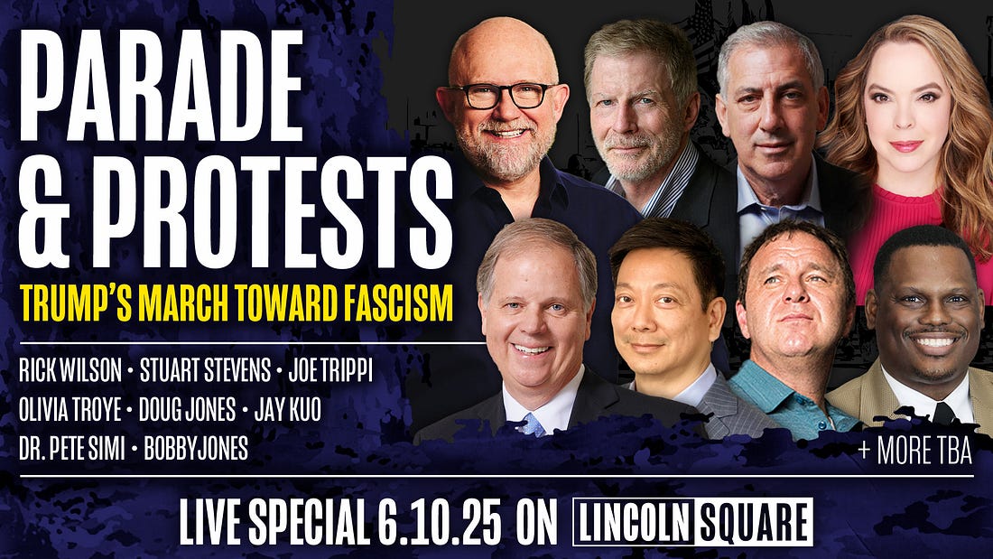 Thank you for being a free subscriber. For all-access to Lincoln Square, and to help us amplify the content that you’re reading to Americans who aren’t paying attention, please consider upgrading your subscription today with this limited-time offer: Hurry! offer ends soon! While the mainstream media is busy hyping Trump’s military parade on Saturday, June 14, you can count on Lincoln Square to give it to you straight with our all-star panel of experts. We’ll break down the historical roots of military spectacle in the U.S. and elsewhere, why Trump is holding this event now, the political ramifications, potential violence, and the rise of the resistance. Rick Wilson, Stuart Stevens, and Joe Trippi will host this must-watch program starting at 5 PM ET on Tuesday, June 10 with special guests: Olivia Troye writes the Substack, Olivia of Troye, and is a former Trump 1.0 administration official with a deep background in national security. Doug Jones is a former U.S. Attorney from 1997 to 2001 and former Senator from Alabama from 2018 to 2021. Jay Kuo is an author and attorney who publishes the Status Kuo on Substack. Dr. Peter Simi is an expert on extremism, political violence, terrorism and hate movements. Bobby Jones is a retired Navy commander and the host of Anchor Watch right here on Lincoln Square. You’re currently a free subscriber to Lincoln Square Media. For full access to our content, our Lincoln Loyal community, and to help us amplify the facts about the assault on our rights and freedoms, please consider upgrading your subscription today with this limited-time offer: |