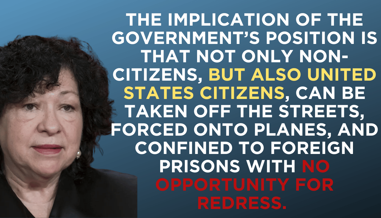 John — Justice Sonia Sotomayor gave a grave warning over Donald Trump's goons rounding up people who are here LEGALLY and trafficking them to a gulag in El Salvador with NO due process