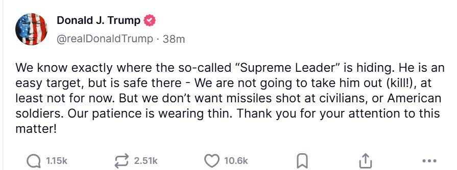 Goldstein For Congress - Please Subscribe and also visit us at www.goldsteinforcongress.com With the Pre-emptive strike in Iran by Israel in the Operation Rising Lion, the G7 gathered in Canada for the 3-day summit in Canada’s Rocky Mountains. G7 countries include France, Germany, Italy, Japan, the United Kingdom and the United States. Several other countries attended as guests. Trump stayed for the “family photo” with European Council President Antonio Costa, European Commission President Ursula von der Leyen, Japan’s Prime Minister Shigeru Ishiba, Italy’s Prime Minister Giorgia Meloni, France’s President Emmanuel Macron, Canada’s Prime Minister Mark Carney, Britain’s Prime Minister Keir Starmer, and Germany’s Chancellor Friedrich Merz. Source (AP) Trump stated: “I have to be back as soon as I can... I have to be back early for obvious reasons.” - To focus on the Middle East. The sole reason why Israel went on the offensive for the first time since 1967 was their realization that these talks would not be fruitful. As of this writing - Trump has called for Iran to have “unconditional surrender” and has also claimed that they know where Khamenei is and: Source - Truth Social It looks like the US is getting ready to enter this engagement. Israel has taken out significant nuclear and strategic centers in Iran and reports from Israel look like the rockets launched into Israel have been reducing the quantity of them. It is a constantly changing environment. The Goldstein Substack is free today. But if you enjoyed this post, you can tell The Goldstein Substack that their writing is valuable by pledging a future subscription. You won't be charged unless they enable payments. |