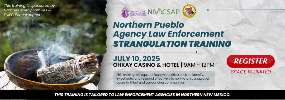 The Coalition to Stop Violence Against Native Women (CSVANW), in collaboration with the New Mexico Coalition of Sexual Assault Programs (NMCSAP) and the Bureau of Indian Affairs (BIA), invites Northern New Mexico law enforcement to a Strangulation Response Training on: