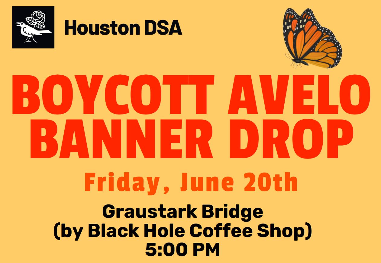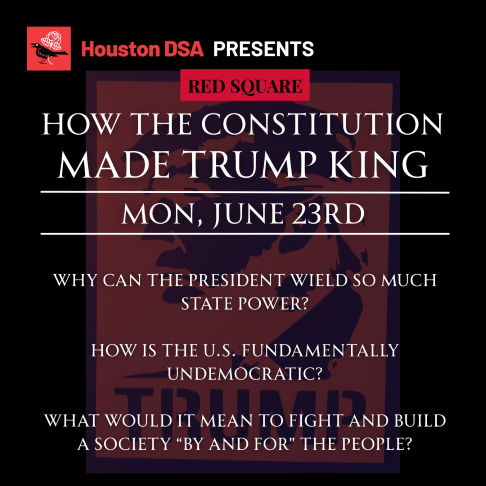 We've been busy as always since our last update. Our crawfish boil fundraiser at the end of May was a huge success -- we raised more than enough money to cover registration fees for our delegates to the DSA national convention this year, and had a great time doing it. Members of our chapter joined the No Kings protest to support a nationwide show of working-class anger at the drastic abuses of power by the US government. Representatives from a rapid-response support network in Houston hosted a scouts training for DSA members to help us report ICE enforcement actions around the city. And at our June general body meeting we elected a new Communications Secretary and a new Endorsements Committee officer-- congratulations to these incoming chapter leaders!