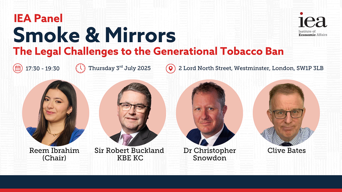 The Tobacco and Vapes Bill introduces a globally unprecedented measure: a generational ban on tobacco sales, preventing anyone born on or after 1st January 2009 from ever legally purchasing tobacco products. This ban infantilises one cohort of adults, discriminates on the basis of age and raises issues of intergenerational unfairness. Even people who have no intention of ever buying tobacco may feel discriminated against if someone a few years older than them has a right that has been withheld from them. The generational ban will create absurd situations, such as a 28-year-old being deemed capable of purchasing tobacco, while a 27-year-old not. In this panel discussion, IEA Head of Lifestyle Economics Christopher Snowdon will discuss the principled and practical objections to the generational tobacco ban, former Lord Chancellor Sir Robert Buckland KBE KC will offer a legal perspective, exploring the ways in which the Bill may be vulnerable to legal challenge, and former Director of Action on Smoking and Health (ASH) Clive Bates will provide his perspective on why the legislation is unworkable. With profound implications for individual liberty, regulatory precedent, and the UK’s international obligations, this event will consider whether the Bill’s sweeping measures can survive legal and economic scrutiny. Date: Thursday 3rd July 2025 Time: 17:30 - 19:30 Location: 2 Lord North Street, SW1P 3LB You’re currently a free subscriber to Insider. For the full experience, upgrade your subscription. Paid subscribers support the IEA's charitable mission and receive special invites to exclusive events, including the thought-provoking IEA Book Club. We are offering all new subscribers a special offer. For a limited time only, you will receive 15% off and a complimentary copy of Dr Stephen Davies’ latest book, Apocalypse Next: The Economics of Global Catastrophic Risks. |