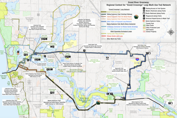 The Grand Crossings Loop is a 24-mile continuous trail that circles the Grand River between US-31 and M-231.