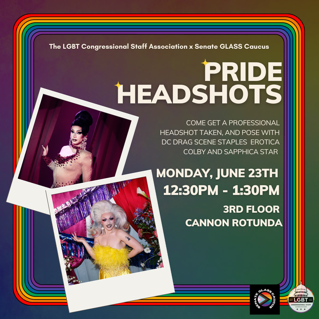 Pride Picture Day – Now on Monday, June 23We’ve rescheduled the previously planned photo day to today, Monday, June 23 at 12:00pm. Celebrate Pride Month with your fellow staffers! We’re kicking things off with a group photo on the Capitol Central Steps at 12:00pm to honor the LGBTQI+ community on the Hill. Then, at 12:30pm, we’ll head over to the Upper Cannon Rotunda (3rd Floor of Cannon) for headshots and fun photo ops with two staples of the DC drag scene, Erotica Colby and Sapphica Star! RSVP here! |