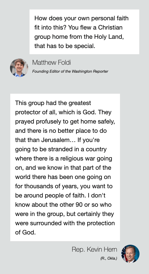 For Rep. Kevin Hern (R., Okla.), “Hern Works” is more than just empty words. The lawmaker, an avid pilot himself, recently embarked on a flight like he’s never done before: bringing recently-rescued constituents from Florida back home to Oklahoma on a Gulfstream Five that he paid for out of pocket. The group of constituents was mostly from several Oklahoma churches who were stranded in Israel amidst an unprecedented level of Iranian ballistic missile fire that left the faithful in need of rescue. Fortunately, a wife of one of the pastors on the trip contacted Hern’s staff, and the work commenced accordingly, culminating in “the most rewarding” flight in the 43 years Hern has been piloting. “We leveraged every conversation we could have between the [Federal Aviation Administration (FAA)], [Transportation Security Administration (TSA)], [U.S. Customs and Border Patrol (CBP)], Department of Homeland Security (DHS), my contacts at the White House on Saturday, when I was in D.C. for the Army parade, talking to people in the White House directly to alert them to this situation, what was going on,” Hern told the Washington Reporter in an interview shortly after he landed the plane. The mission to rescue the Americans cost “well over a million dollars,” Hern estimated. Most of those costs went to Grey Bull, a firm loaded with American Special Forces veterans known for rescuing Americans stranded in war zones across the world. Hern said he paid about $60,000 and that he is not looking for a GoFundMe to recoup the costs, because embarking on the congressional rescue mission was simply “the right thing to do.” “I'm just fortunate,” he said. “I've been blessed in my life to have [a] successful business career.” “You're blessed to be in this country for the opportunities it brings,” Hern continued. “And to be able to pay back to the greatest nation that’s ever existed is quite an honor.” Both Hern and his constituents were lucky that the Biden administration was out of power while the Iranian ballistic missiles were flying. “The federal government did a lot of work,” Hern said. “There were no pushbacks from anybody at State or DHS or CPB or TSA or FAA. Every particular person that I called in each of those particular areas, I would call up and I'd say, ‘how can I help you?’” “And they’d say ‘call this person at this agency’ and I would do that, get them on a conference call, and we would get that clarified, and they moved very quickly,” he added. Heard on the Hill