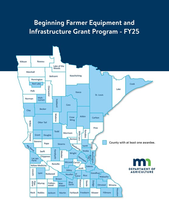 Minnesota counties where FY25 Beginning Farmer Equipment and Infrastructure grant recipients operate highlighted in blue.