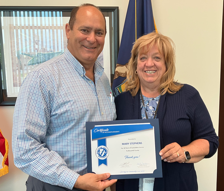 Clerk Forlini recently honored Register of Deeds staff member Mary Stephens for 10 years of cumulative service to the County. Mary received a "Certificate of Accomplishment" from the Executive's Office.