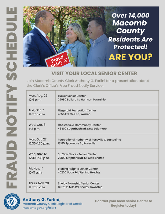 Fraud Notify is a FREE service, which notifies you of potential property fraud, and is offered to all Macomb County Residents. Learn more on how you can sign up by attending one of the Clerk's presentations near you. Contact your local senior center to register today!