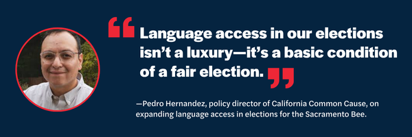 Colorado ⛷️: Earlier this year, Colorado adopted a Voting Rights Act we helped author to protect and expand state voting rights in the face of quickly eroding federal protections. Common Cause’s Aly Belknap spoke about what's next when it comes to expanding multilingual access in the state’s elections. Read more in Bolts Magazine.