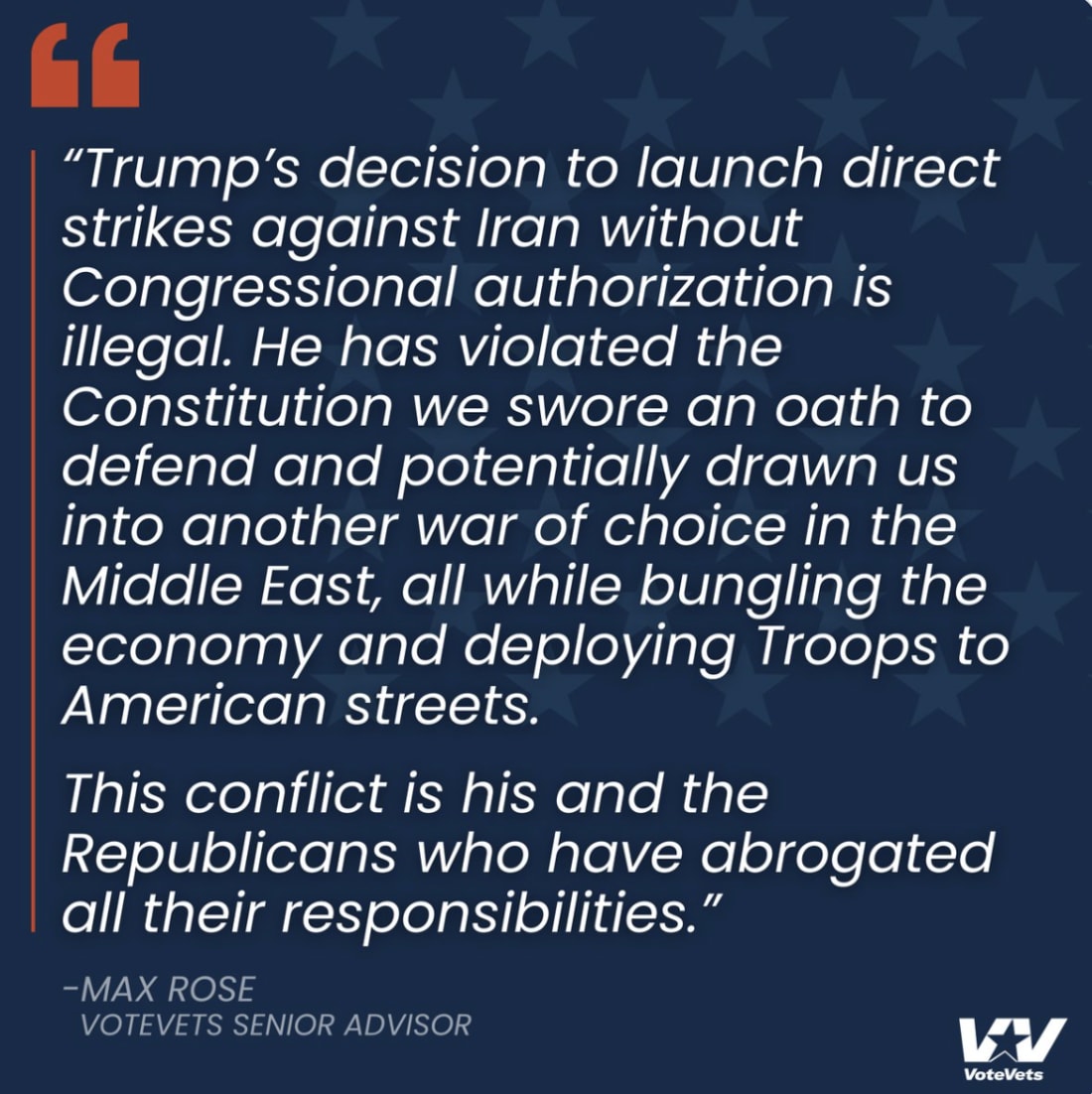 Full access to Blue Amp for only $1.32 per week is part of our plan to build out a Creators’ Fund, to give grants to smaller creators to build an indy-media ecosystem Get the truth corporate media ignores. From a former Biden ad man & former Emmy-winning MSNBC anchor who know how DC works & share what’s behind the curtain Amplify Good. Support Indy Media Among his other notable gems: "I was never a big fan of John McCain, disagreed with him on many things including ridiculous endless wars and the lack of success he had in dealing with the VA"He's a war hero because he was captured. I like people that weren't captured, okay? I hate to tell you." July 18, 2015."Look, I don't want any wounded guys in the parade. This doesn't look good for me." Summer 2017.Trump has denied having made even more disparaging comments about the military and is now trying to rebrand himself as a warrior and patriot. And now we’re at war. Not a declared war. Like every other President since World War II, he just did went ahead and did it and Congress, which has exercised none of its Constitutional Authority—Mike Johnson is literally asleep at the switch—is complicit in letting him get away with it. This occasion is not unique in that regard. Apparently at least one veterans group was unhappy with Trump’s unilateral decision to bomb a country with which we weren’t at war: But Senator Lindsey Graham and other Trump allies were quick to circle the wagons around the President, right after the bombing and even more so in the week since, as he’s taken criticism from the Left and the Right Iran, of course, said the strikes had no effect and warnings were extended to American servicemen on bases overseas to be prepared for a counter attack. Drones and missiles are to be expected from one the largest sponsors of terrorism in the world - and the threat of terrorism extends to U.S. territory. Trump may have said the strikes were an overwhelming success, but as often as Trump has lied about anything and everything, you cannot take him at face value. Nor can you take the Iranian government at face value. There is a history there that precludes trust on both sides. But as last week wore on it became clear, via objective observers, that little was accomplished. Which begs the question, how will Trump follow up? And beyond the expected condemnations and lickspittle Lindsey Grahams, what will other domestic interests do? For example, many Arab-American groups in the United States helped put Donald Trump in the White House. They voted for him as protesters chanted “Genocide Joe has to go” at various events across the country, in reference to former President Joe Biden who they claimed was “too close” to Israel and Benjamin Netanyahu. Trump’s statement pledging how close a “team” he and Netanyahu are will not easily be forgotten by the Arab-American community. But Trump either didn’t figure that into the calculus of today’s events or didn’t care to. He already got what he wanted from them. The only thing for certain is that the world just got a lot less safe in the short run. No one knows what it will bring long term and Trump’s demands for immediate peace - to the Middle Eastern mind is a staggering bit of grandiose drama. “To them it will be like a bully smacking you to the ground and saying ‘Give up!’ That’s not how it works,” a member of the Department of Defense told me on background.