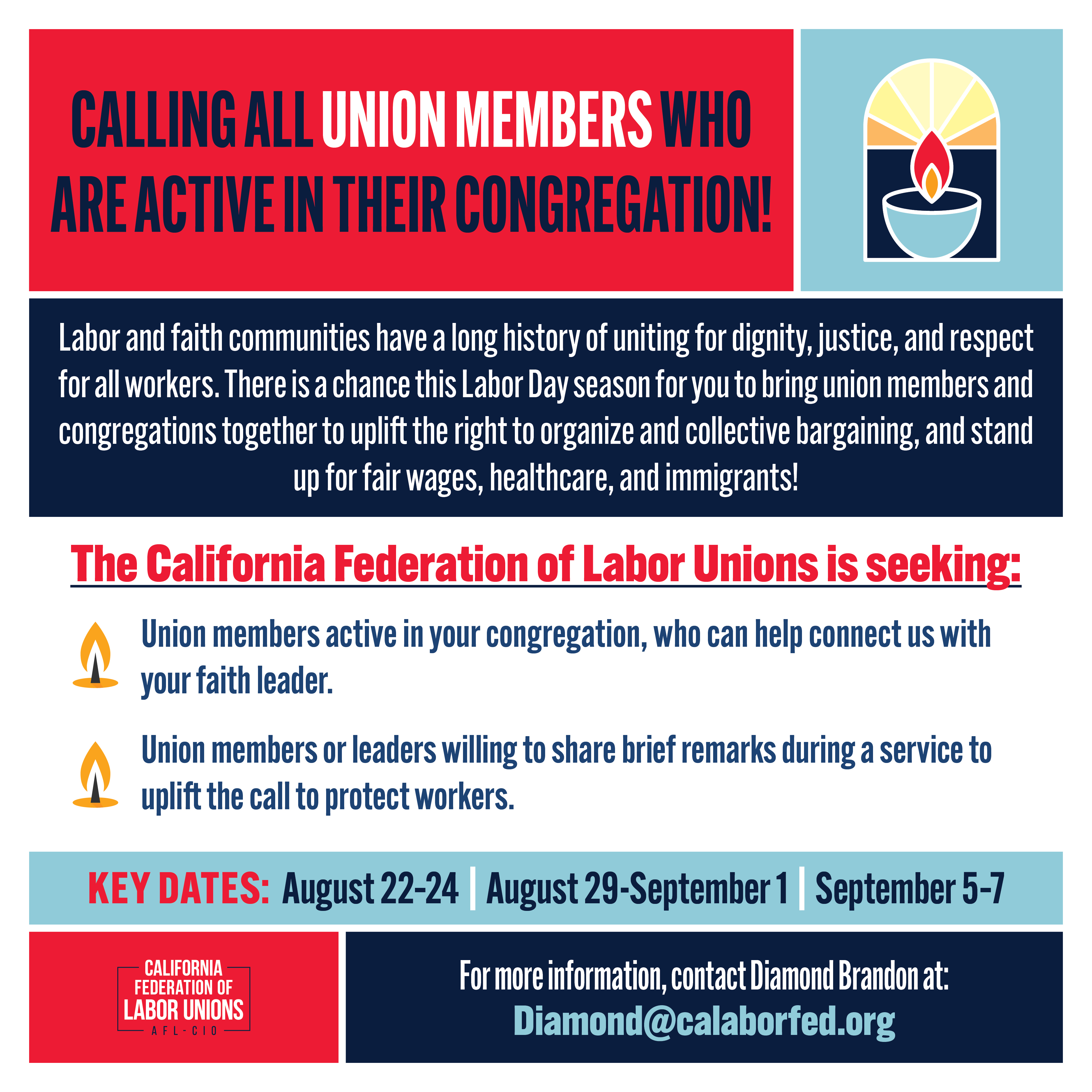 To that end, the California Federation of Labor Unions is seeking members who are active in their local congregations to reach out to their faith leaders and encourage them to allow for a union member to briefly address the congregation and share worker stories.