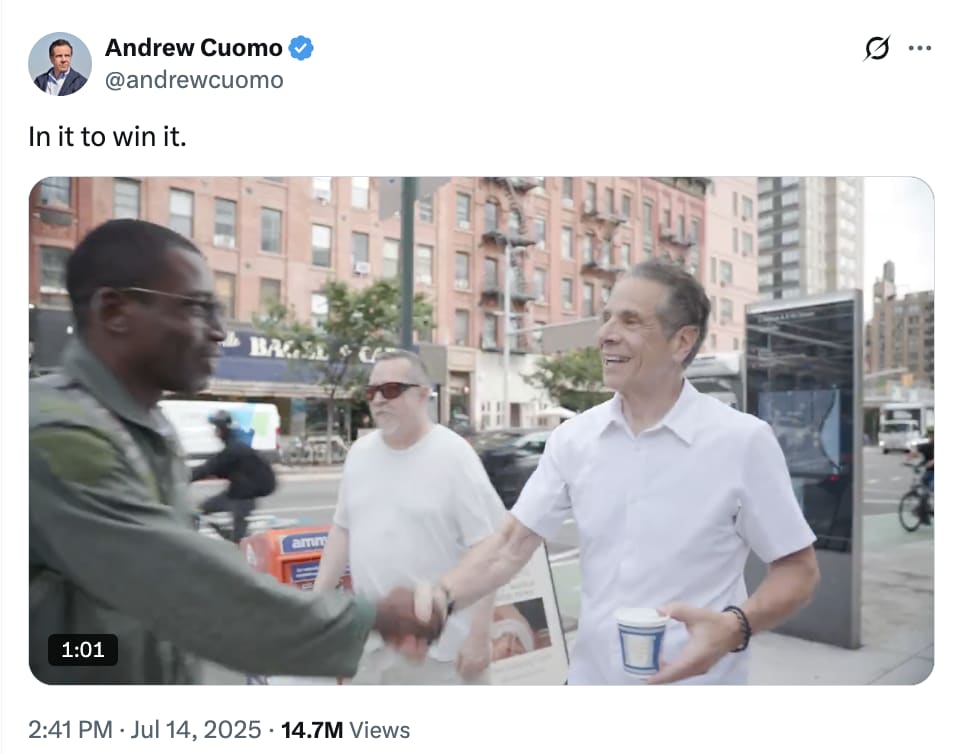 Cuomo posted a campaign video on X titled “In it to win it,” vowing to fight for “lower rent, safer streets” and better housing under the new “Fight and Deliver” ballot line. He joins a crowded November race alongside Mamdani, GOP nominee Curtis Sliwa, and current Mayor Eric Adams, who is also running as an independent.