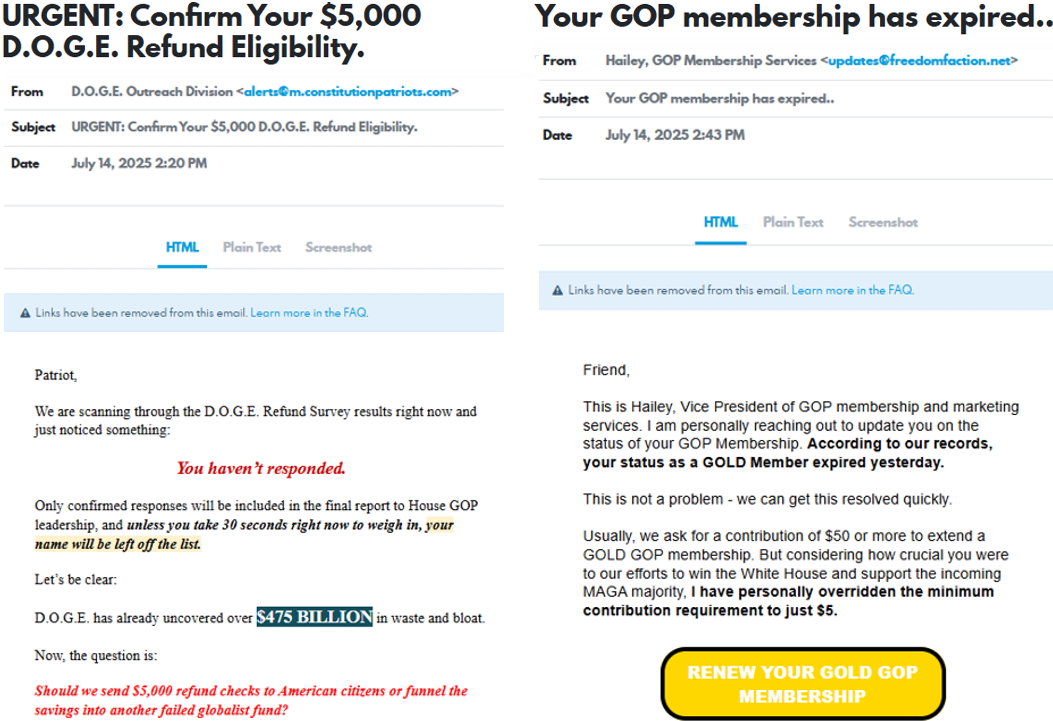 You know what undecided voters care about? It’s not a MAGA super PAC and it’s not James Comey. The three things that swing voters cared about most in the 2024 presidential election: the economy, immigration, and social security/Medicare. These emails push extremism and actively make it harder to win more undecided voters. They advance a narrative that politics isn’t about helping people, but that it’s about tearing the other guy down. And reading these emails, maybe that narrative is right. A lot of email fundraising is just a griftHere are a few examples of that: