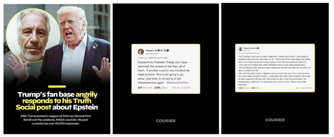 Howdy, folks! It’s ROUNDUP time. As always, thank you for being a part of this 50,000+ community. I’m so grateful for your support. The internet could NOT stop talking about Epstein this week — and neither could we. COURIER covered House Republicans’ unanimous vote to block the release of the Epstein files, the flip flopping of far-right talk show hosts, and Trump’s continuous stream of (nonsensical) responses. Now let's dive into this week's ROUNDUP! - Charlotte Robertson P.S. If you haven't already, give us a follow on social (like and subscribe to our YouTube, Instagram, TikTok, Bluesky, Threads, and X/Twitter) to make sure you don't miss anything. The “right” to censor books is another made-up doctrine of the Roberts CourtCOURIER’s Lisa Graves breaks down how the Supreme Court’s ruling in the Mahmoud v. Taylor case ignores legal precedent and hands parents the power to censor public school books in this week’s Grave Injustice. MAGA is big mad about Jeffrey Epstein"Trolling MAGA over Epstein is a good use of our time, and I applaud any and all efforts to do so," COURIER’s Ctrl Alt Right Delete author, Melissa Ryan, writes in this week’s newsletter. 5 scenarios for staving off a dictatorshipIn this week’s edition of Stop the Presses, COURIER’s Mark Jacob lays out five scenarios for staving off a Trump dictatorship and makes the case that it’s not too late for us to fight back. Advertise in this newsletterDo you or your company want to support COURIER’s mission and showcase your products or services to an aligned audience of 190,000+ subscribers at the same time? Contact [email protected] for more information. COURIER dropped the finale episode of Represent: On The Trail with Deja Foxx, a three-part docuseries that followed the 25-year-old activist throughout her ultimately unsuccessful, but innovative, campaign for Congress. Deja’s use of new media — and the unique fly-on-the-wall access shared by Represent — is being talked about by outlets like the Washington Post as a major takeaway for future candidates. On COURIER's TikTok, you can see the top post of the week here with 2.1+ million views and 283,000+ likes. On COURIER's Instagram, you can see the top post of the week here with 15+ million views and 192,000+ likes. Republicans vote to block the release of the Jeffrey Epstein filesDespite backlash from MAGA around Trump’s refusal to release the Epstein files, Republicans on the House Rules Committee voted to back Trump and block the release. COURIER has the video. Trump’s fan base lashes out on Truth Social after he defends Attorney General Pam BondiTrump’s Truth Social post backing Attorney General Pam Bondi — who denied the existence of the Epstein files — sparked a wave of anger from his own base. COURIER has a roundup of MAGA’s responses. Soccer player visibly confused as Trump stands in front of him at awards ceremonyChelsea star Cole Palmer appeared visibly confused as Trump stood center stage during the trophy ceremony at this weekend’s FIFA Club World Cup, relishing in the attention. COURIER has the video. Advertise in this newsletterDo you or your company want to support COURIER’s mission and showcase your products or services to an aligned audience of 190,000+ subscribers at the same time? Contact [email protected] for more information. Detained by ICE, a Phoenix woman with leukemia faces death without medical careDetained for months and denied proper cancer treatment, Arbella “Yari” Rodríguez Márquez is fighting for her life inside one of ICE’s deadliest facilities. COURIER’s Arizona outlet, Copper Courier, has the story. Now that Trump’s tax bill has passed, 100,000+ Iowans will lose their insuranceMore than 100,000 Iowans stand to lose Medicaid coverage under Trump’s recently passed “One Big Beautiful Bill" — COURIER’s Iowa outlet, Iowa Starting Line, has the story. ICE officers detaining Lehigh County residents sparks fear“ICE officers are detaining and arresting immigrants at the Lehigh County Courthouse, angering local residents,” reports COURIER’s Pennsylvania outlet, The Keystone. |