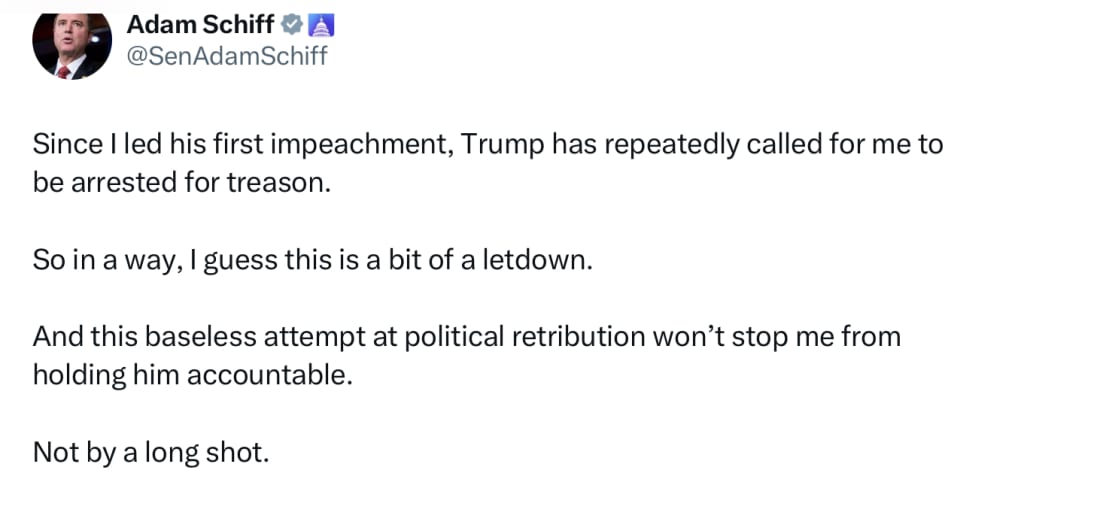 And a photo (someone is turning in language for a new ballot measure!). Let’s go… Trump’s Latest Clash with His Obsessed Nemesis: “Shifty Schiff”Trump accuses Senator Adam Schiff of mortgage fraud - the Senator’s fixation on the president fuels another predictable spat. Few in Congress rival Senator Adam Schiff’s (D-CA) obsession with President Trump, a fixation that screams Trump Derangement Syndrome like no other. As the lead prosecutor in Trump’s first impeachment in 2020, Schiff pushed a Russia collusion narrative that fizzled without evidence. His relentless attacks—calling Trump’s policies “authoritarian” on X in 2024 and slamming his State of the Union earlier this year as “lies”—cement his role as Trump’s chief antagonist. Trump hasn’t held back, dubbing him “Shifty Schiff,” a “sleazebag” in 2019, and “scum” from the Oval Office. So, to exactly no one’s surprise, another back-and-forth has erupted, and it merits coverage because it’s happening. As someone analyzing this with a tilt toward the president, I’m skeptical of the latest accusations’ veracity but yesterday Trump posted on Truth Social alleging Schiff committed “possible mortgage fraud” by misrepresenting a Maryland home as his primary residence from 2009 to 2020 for better mortgage rates. Schiff fired back on X, calling it a “baseless attempt at political retribution” and also recording a four and a half minute response (that should have been 30 seconds, and spared us all). Do I think it is likely that Schiff committed the fraud alleged by the President? No. Is it possible? I guess. My friend and longtime conservative leader Jim Lacy thinks the Los Angeles County Tax Assessor Jeff Prang should open up an investigation, and that if he is not willing to do so, that the District Attorney should do so. Well, don’t wait on Prang, who is part of the elite Democratic structure in Los Angeles. The former left-of-left West Hollywood City Councilmember as launched into countywide office with support from Rep. Maxine Waters and the Democratic Party. The D.A., Nathan Hochman, a Republican-turned-NPP, seems pretty moderate in temperament to want to take on a U.S. Senator. We’ll see. Bottom line: Both Trump and Schiff will continue to go after each other, and both will trumpet their attacks to their respective bases. And we get to eat 🍿. Must Listen Podcast- Featuring Insightful Analysis from.. ME!The latest episode of National Review’s Radio Free California is out, and sitting in with regular host Will Swaim is yours truly, subbing for regular co-host David Bahnsen… If you have the time, now or when you’re out on your big daily walk (you know you need to do that) — take a listen. It’s 90 minutes, but worth every moment of your time. In all seriousness we talk about Newsom’s 4 hour podcast appearance on the popular conservative Shawn Ryan show. I can’t recommend you listen to the four hours - some of us did. We also talk about the immigration show-downs in Los Angeles and Ventura Counties, and a lot of talk about efforts by the California Legislative Black Caucus to pass legislation to offer reparations to the descendants of former slaves. Here is a link to the podcast website, where you can play it, or they have links to all of your favorite podcasting apps. And to make it easier for those of you on iPhones, here’s the direct link to the show on the native Apple Podcasting App. Ring: Progressive Policies Cause Moral and Functional DecayEdward Ring’s American Greatness column today argues California’s progressive policies cause moral and functional decay, hidden behind equity and environmental rhetoric. He cites failing schools, rising crime, and budget deficits, driven by choices inflating living costs and stifling innovation. Ring highlights Highway 1’s closure from landslides, blamed on climate change, not neglect. He calls progressivism a “grift” benefiting special interests, eroding quality of life with neglected infrastructure like dying redwoods, labeling it a human and financial tragedy. Photo Of The DaySenator Tony Strickland and Assemblyman Carl DeMaio announce the filing of language for a VOTER ID initiative. This is the first step towards ultimately gathering signatures to hopefully see this on our ballots next November. You can be sure I will be writing plenty on this between now and then! (Photo credit: @EytanWallace) Hope you’re having a great day! Jon P.S. This morning I published a lengthy analysis of Gavin Newsom’s threats to redraw California’s Congressional District lines. I thought I would draw your attention to a column today in the Los Angeles Times from Mark Barabak where he refers to Newsom’s proposal as All hat and no cattle. So, Does It Matter? - with Jon Fleischman is free today. But if you enjoyed this post, you can tell Jon that his writing is valuable by pledging a future subscription. You won't be charged unless he enables payments. |