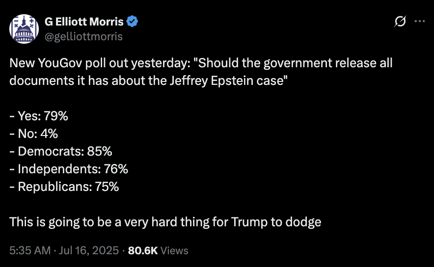 Let’s get a little meta here and dig into the Epstein fallout from a political perspective. Is this weird conspiracy theory really what we should be focusing on? I am a student of the Dan Pfeiffer philosophy that we exploit issues that unite our party and divide the other party. Democrats are united in their desire to see the Epstein files released. Most Republicans also want to see the Epstein files released, other than a small faction of the most hardcore MAGA supporters. A YouGov poll from July 15 revealed as much: It is political malpractice not to exploit an issue that unites 85% of Democrats, 76% of Independents, and 75% of Republicans— leaving Donald Trump and his sycophants appealing to a pathetic four percent of Americans. Elevating independent or rightwing voices Trump’s position has earned him bipartisan criticism. He’s being assailed by the likes of Joe Rogan, Theo Von, Andrew Schulz, Dave Smith, Shane Gillis, and many others. We should highlight their voices for two reasons: first, if you’re a Democrat, you may not have much credibility with Independents or Republicans. I certainly have far less credibility with Trump supporters than Joe Rogan - who helped Trump get elected - has with those same people. Which means that while my criticism may not carry much weight, his does. If I can help share effective criticism, why wouldn’t I jump at the opportunity? This is not about validating rightwing platforms or endorsing all of their opinions; this is about amplifying a message that will be particularly persuasive among the broader universe of voters. Period. Remember: the goal of politics is not purity; it’s winning elections, gaining power, and enacting our agenda. Second, we need to create an incentive structure for those flirting with anti-Trump messaging to speak out. For example, Theo Von weighed in on this issue: If we attack Theo Von as he’s criticizing the Trump administration (“You voted for this!”), what incentive is there for him to criticize them further? None. So throw him a like and retweet, and welcome his voice into the chorus of other voices speaking out. Our response cannot be to scold those who can be our allies - effective allies! - in this fight. The right is very good is offering positive reinforcement to those who promote their agenda, and as a result, those people do it over and over until they’re fully red-pilled. We can’t let our pride or egos get in the way of smart politics. We win by adopting a strategy of addition, not subtraction. Aren’t there more important issues to focus on? Yes and no. There are no shortage of people who would say that the ICE raids, cuts to healthcare and food assistance, the dismantling of the ACA, the abandonment of our climate goals, and the sustained attack on the judiciary are more important than the files related to the wrongdoing of a dead pedophile. Other people would say that holding the other people involved in the crimes of that dead pedophile accountable for their behavior is also extraordinarily important. The reality is that we shouldn’t dismiss either one. But let’s consider the reality of our media environment. It is very, very rare for a political issue to break through in a way that the Epstein story has (on Thursday night, it was even mentioned at the ESPYs). It’s even more rare that it redounds to the political benefit of Democrats and to the detriment of Trump and Republicans. In moments like these, it’s not only impossible but unwise to try and swim against the tide. The country is united in its opposition to Trump and Republicans on this issue. There will be many, many opportunities to discuss healthcare and immigration and the courts and everything else this administration is doing. But in this moment, take the win and join the chorus of voices - left, right, and center - in giving this White House its much deserved derision. How should we talk about this? The questions write themselves. Why did Trump lie to his supporters about releasing the Epstein files? What is he hiding? Is he in the files? Who is he protecting? Whatever he’s trying to keep under wraps must be bad enough to warrant his insistence that he would rather lose the support of his own voters than humor their demands for the information (that he himself promised them) to be released. Trump’s supporters voted for him because they believed that - his own warts notwithstanding - he would be the one who could expose the systemic corruption that allows powerful, wealthy elites to get away with heinous crimes. Instead, they’re learning that not only does Trump have no intention of exposing that systemic corruption, he’s actually entrenching it. Put simply, if you plan on staking your reputation on exposing criminals, don’t act surprised when your reputation craters once you opt to protect them instead. You're currently a free subscriber to Brian Tyler Cohen. For the full experience, upgrade your subscription. |