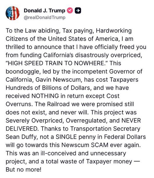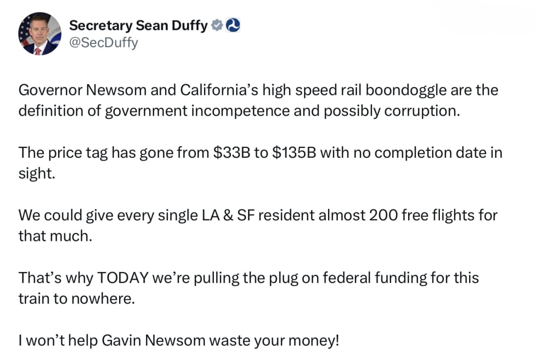 ⏱️ 3 minute read - 4 if you you watch the videoThe End of a Taxpayer NightmareAfter strongly signaling that this would happen, President Trump’s administration delivered a long-overdue blow to California's high-speed rail project, one of the most egregious examples of government waste. Federal funding—$4 billion in unspent grants—has been yanked, halting a boondoggle that has devoured billions while delivering broken promises. This move, spearheaded by Transportation Secretary Sean Duffy, follows a scathing federal review exposing missed deadlines, budget overruns, and inflated ridership projections. Initially pitched at $33 billion with a 2020 completion date, the project now carries a $106 billion price tag, with track-laying only beginning in 2025 after 16 years and $15 billion spent. Trump himself didn’t mince words on Truth Social: Secretary Duffy echoed this sentiment on X: And he attached this hard-hitting short video to his X post… The Federal Railroad Administration’s report backs this up, citing a $7 billion funding gap and failure to meet grant obligations. This wasn’t sudden. As I wrote earlier this year, the U.S. Department of Transportation had been sounding alarms about this project’s mismanagement for months. The writing was on the wall: a project this bloated, delayed, and disconnected from reality was bound to collapse. A Project Doomed from the StartIn 2008, California voters approved a $10 billion bond for a high-speed rail line connecting San Francisco and Los Angeles, with promises of efficiency and economic growth. The plan was ambitious: an 800-mile system, 220 miles per hour, completed by 2020 for $33 billion. Fast forward to 2025: costs have ballooned to $106 billion, the timeline has been pushed to 2033 for a mere 119-mile segment from Bakersfield to Merced, and track-laying has only recently begun on a limited section. The California High-Speed Rail Authority has spent nearly $15 billion on planning, land acquisition, and partial infrastructure, with little to show. This wasn’t just poor execution but a miscalculation from day one. Overregulation, bureaucratic red tape, and a refusal to adapt turned a bold idea into a fiscal black hole. The state’s cap-and-trade funds, meant to support the state’s quixotic efforts to reduce human-made carbon emissions, have been siphoned into this sinking ship instead, with Governor Gavin Newsom proposing to lock in $1 billion annually through 2045. Meanwhile, private investors are hesitant, and the project’s ridership projections—wildly optimistic from the start—have been debunked by federal auditors. This was a train wreck waiting to happen. Newsom’s Desperate DefenseGavin Newsom isn’t going quietly. The governor, who has staked his political future on this project, called the funding cut “illegal” and vowed to fight back. In a statement, he declared, “Trump wants to hand China the future and abandon the Central Valley. We won’t let him.” He touted progress—171 miles under construction, 50 major structures completed, and track-laying on the horizon—while accusing the Trump administration of breaking legally binding agreements. California High-Speed Rail Authority CEO Ian Choudri echoed this, insisting the state has met every obligation. Newsom owns this disaster. As governor, he scaled back the project in 2019, admitting there was “no path forward” after costs hit $77.3 billion, yet he doubled down on the Central Valley segment. His administration’s mismanagement—missed deadlines, budget shortfalls, and a refusal to address federal concerns—invited this cut. He’s threatening and framing lawsuits as patriotic, but the numbers don’t lie. This project’s failure is a direct reflection of his leadership. An Albatross for a Presidential HopefulAs Newsom eyes a White House run, this high-speed rail fiasco becomes a significant liability. The project’s failure —$106 billion in costs with minimal results—undermines his credibility on fiscal management and government competence. Trump’s funding cut gives Republicans a powerful talking point about wasteful Democratic spending, while voters increasingly skeptical of big-government projects will question Newsom’s ability to deliver on promises. So, Does It Matter?Today’s funding cut isn’t just a policy win; it’s a wake-up call. Taxpayers deserve better than projects that prioritize optics over outcomes. California’s high-speed rail was a fantasy sold on hope, not reality, and its collapse was inevitable. A shameless giveaway by Newsom, and Jerry Brown before him, to their union backers. We can hope this marks the end of such extravagance—and a return to common sense in how public funds are spent. But with Newsom and his Democrat Supermajorities in the State Legislature controlling state policy, do not hold your breath. So, Does It Matter? - with Jon Fleischman is free today. But if you enjoyed this post, you can tell Jon that his writing is valuable by pledging a future subscription. You won't be charged unless he enables payments. |