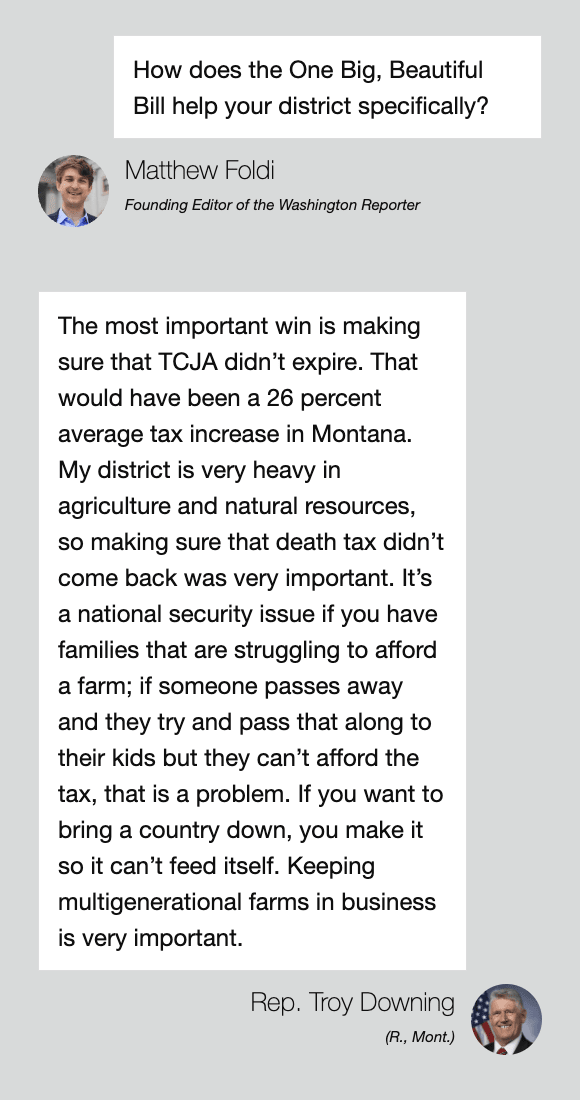 Following the successful passage of a historic reconciliation bill, the Washington Reporter interviewed 15 House Republicans about the bill’s wins for their districts and what they want from the next reconciliation bill that could come as soon as this fall. Even after the One Big, Beautiful Bill’s (OBBB) passage, lawmakers are eager for more reconciliation. Rep. Mariannette Miller-Meeks (R., Iowa) said that she’s “in favor of doing more than one reconciliation bill,” and that in future ones, she’d “like to see us do more stuff on reforming Medicaid and the Affordable Care Act so people have access to insurance.” “There are unequal provisions in the ACA that made it difficult by design for small businesses to offer insurance,” Miller-Meeks said. “I’d also like year-round E-15, since I’m from Iowa. We also want to also keep providers independent.” Miller-Meeks added that she has been traversing town halls across her district, and union workers, law enforcement officers, and seniors have been thanking her for the work on the bill. Rep. Derrick Van Orden (R., Wis.), a former Navy SEAL, was undeterred by the chaos of the first bill. “I want to see a reconciliation bill once a month,” he said. “This helps us tackle waste, fraud, and abuse.” Van Orden also said that the OBBB “rocks for the 3rd District” — provisions like the provider tax were specifically important, but other provisions have made their way through the “pub culture” of Wisconsin, and people like what they see. Heard on the Hill