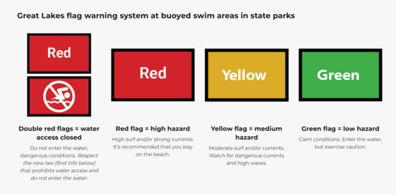 At buoyed swimming areas in state parks, the DNR uses a flag system to indicate water conditions. Knowing what each flag means can help keep you and your family safe this summer.