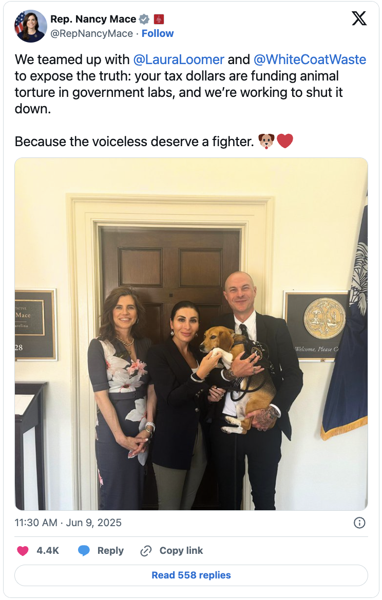On June 5, 2025, WCW Senior Vice President Justin Goodman and Laura Loomer met with Rep. Nancy Mace. Our agenda? End dog and cat testing at the DOD.