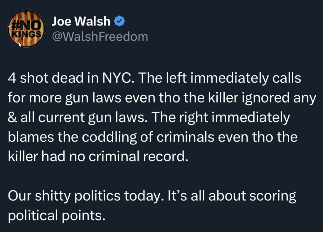 Joe, I love you and am SO glad you joined the Democratic Party, but I have to respectfully disagree with you on this. These mass shootings are horribly unique to America. There are no other “civilized” countries on the planet with the amount of gun deaths we have. NOT even close. When gun deaths are the number one killer of children, there should be a five-alarm fire, but this country has proven time and time again that guns are far more valuable than any of its citizens and the most vulnerable (our children).