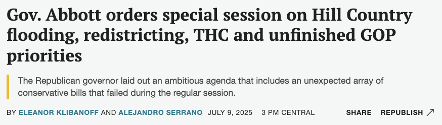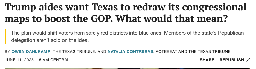 A month ago we heard rumors that President Trump asked Gov. Abbott to redistrict Texas and create more Congressional seats. Not because of updated data. But because the polling shows he grows less popular by the day.