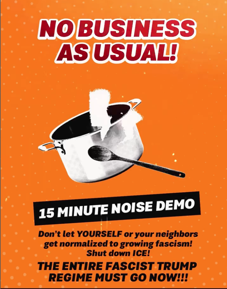 - 15 minutes of noise every Wednesday to build up the networks, habits, and culture of nonviolent resistance in neighborhoods, workplaces, and schools, so that by the fall, it becomes a known mass phenomenon that the joyful, defiant, unmistakable noise at 6pm is the people demanding Trump Must Go Now!