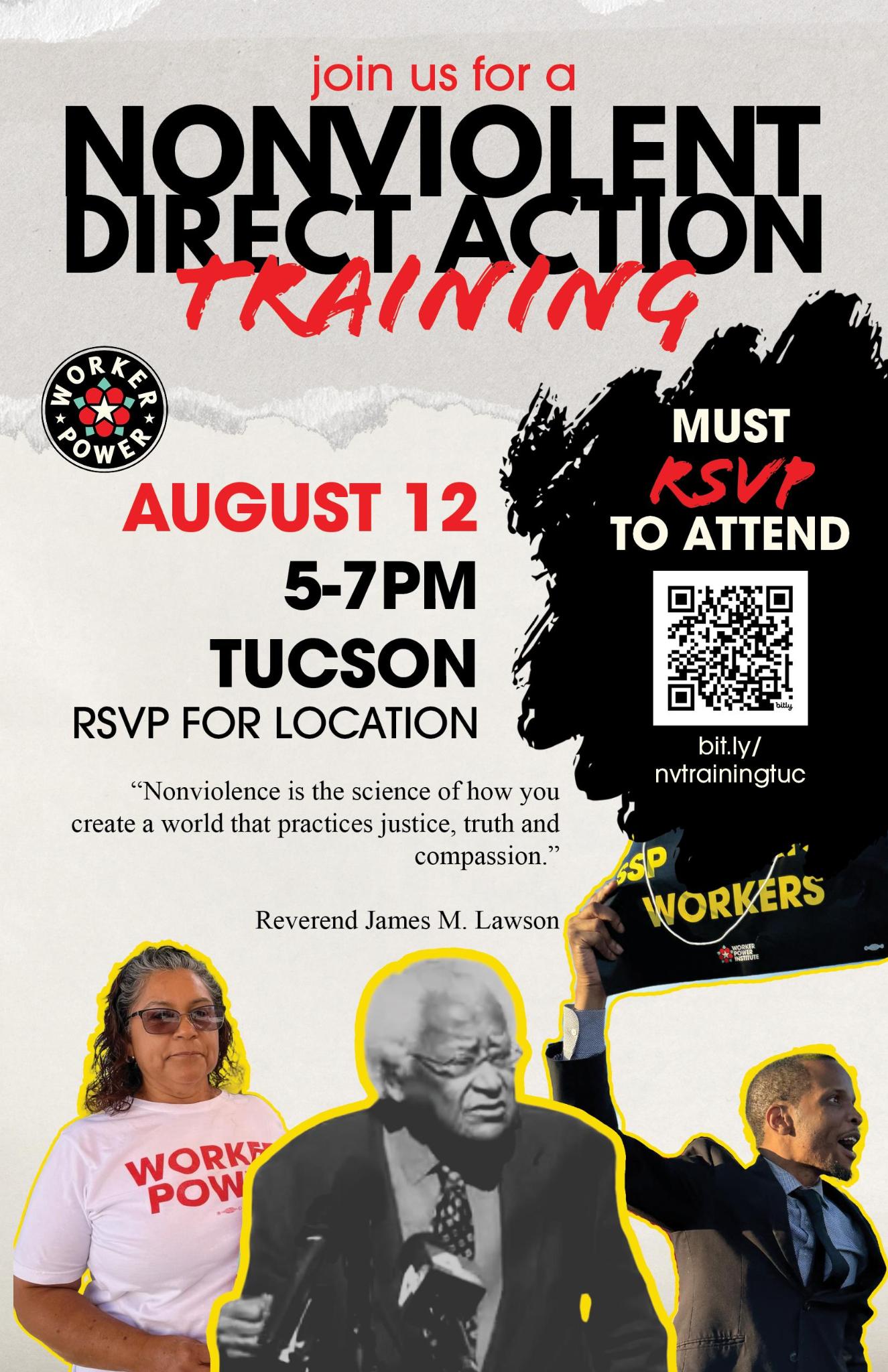 on August 12th join Worker Power for an interactive session that equips participants with the principles and practical tools of non-violent direct action. Rooted in a rich history of social change, the training will cover strategy, group dynamics, creative protests methods, and how to stay grounded and safe during action.