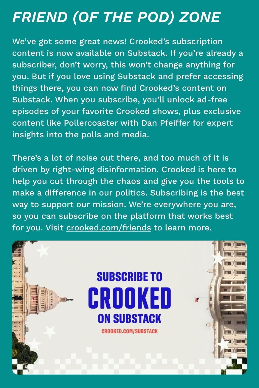 What A Day: Fright ClubTrump is planning a UFC cage match on the White House lawn. You read that right.Welcome to Crooked Media Don’t recognize this sender? Unsubscribe with one click Crooked Media recently imported your email address from another platform to Substack. You'll now receive their posts via email or the Substack app. To set up your profile and discover more on Substack, click here. WHITE HOUSE OF PAINDonald Trump’s plan to host a UFC cage match at the White House is the ultimate symbol of his incessantly distracting, made-for-TV presidency. Pay no attention to that troubling economic data, or those mysterious Epstein files!