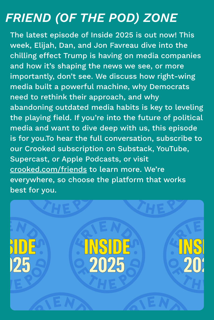 Judge Reyes also slammed Trump’s team for misspelling the name “Terrance” in Bondi’s order appointing him the city’s top cop. “It doesn’t give a lot of confidence if you can’t get the name right,” Reyes deadpanned. CRÈME DE LA KREMLINDonald Trump literally rolled out the red carpet for Russian dictator Vladimir Putin today in Alaska, where the former best buddies rekindled their bromance… and, so far, haven’t achieved much else. Trump’s most eyebrow-raising moment of this bizarre, much-hyped, underwhelming summit occurred before it even started, during a Fox News interview. “I’d like to see a ceasefire,” Trump told the outlet during his flight to Alaska. “I wouldn’t be thrilled if I didn’t get it, but everyone says, ‘You’re not going to get a ceasefire. You — it’ll take place on the second meeting.’” And just like that, Trump set sky-high expectations for his second meeting, which has yet to even be scheduled, with the former KGB spymaster. His team set expectations low for this summit because there was no way he’d score a deal. Next time, they’ll have an even tougher time backtracking on the president’s lofty goal. As of this writing, Trump and Putin are moments away from a press conference, which you can watch in real time right here. WHAT ELSE?ICE plans to double its number of immigrant detention spaces this year, according to documents seen by the Washington Post. The plan is to add 41,000 beds, for a total of 107,000. Relatedly, ICE Barbie Kristi Noem is shacking up rent free at a Coast Guard commandant’s home, because she has been “so horribly doxxed and targeted that she is no longer able to safely live in her own apartment,” according to DHS. So, uh… why doesn’t she have to pay rent, again? The U.S. military deployed 4,000 Marines and sailors to the waters around Latin America, in a move that gives him new latitude to follow through on his threats to target cartels. The White House is secretly rating companies based on how supportive they’ve been of Trump’s “big, beautiful bill,” Axios reports. So, if companies wanna do business with the U.S. government, they might get shot down if they haven’t kissed Trump’s ring. Love these mob boss tactics! Costco won’t sell abortion pills after conservative pushback. It’s a huge win for the religious right, and a huge loss for American women, who use pills to end pregnancies more than any other method. Global talks on plastic collapsed today after the U.S. opposed the production limits that other countries support. The State Department doesn’t want any limits on plastic production or restrictions on additives, an official told the Washington Post. That’s a stance supported by countries that are always in line with the United States, such as Saudi Arabia, Iran and Russia! Excuse me, I feel the microplastics in my brain beginning to crinkle. Oklahoma schools will start giving teachers from “liberal” states tests to keep “away woke indoctrinators,” according to the state’s top education official. If they don’t pass the test, developed by the right-wing media company PragerU, they won’t earn a teaching certificate and won’t be able to teach in public schools for the year. I personally give this idea an F-minus. Louisiana’s attorney general is suing gaming platform Roblox over its safety protocols, accusing it of being “the perfect place for pedophiles.” More than 100 million people use the platform, and one-third of them are under 13. While Roblox is home to scores of mundane games, it also has some questionable “experiences,” including “Escape to Epstein Island,” “Diddy Party” and “Public Bathroom Simulator Vibe,” according to the lawsuit. Roblox? More like: Oh-hell-no-blox! Light at the End of the Email…A federal judge struck down two of the Trump administration’s attempts to target diversity, equity and inclusion programs at schools and universities. The woke mob strikes again, mwa-haha! Solar panels that can fit on balconies and decks are becoming more popular in the United States, even as Donald Trump scraps many of the country’s climate initiatives. Some plug-ins cost just a few hundred bucks, while users save dozens of dollars a month and reduce their carbon footprint. Pop Star Bad Bunny’s residency in Puerto Rico is causing the island’s economy to boom, with thousands of tourists flying in from around the world to watch him bust a move. Normally, hotel bookings dwindle ahead of hurricane season. But more than 48,000 nights have been booked, and some 25,000 concert packages were sold in a single day, according to organizers. “We can argue that they’re the prettiest, but they’re beaches. What makes us unique is the culture. No one can steal that,” a local tourism company spokesperson said. A U.S. Air Force veteran opened a sanctuary for monkeys in need last fall, and it has unexpectedly become a place of solace for fellow veterans who struggle with post-traumatic stress disorder. “There’s something magical that’s happening here,” the founder said. “There’s such a peace that we have.” And with that, meet Maybel, one of the sanctuary’s adorable monkeys who apparently loves grapes. You’re currently a free subscriber to Crooked Media. For the full experience, upgrade your subscription. |
