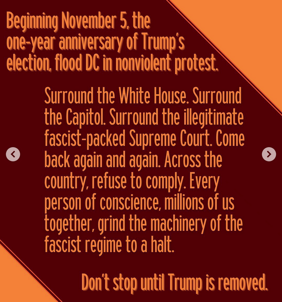 Commit to being in Washington D.C. beginning 11/5/25. Not for a one-day protest, but with relentless, non-violent resistance that doesn't top until such a political crisis is created that Trump must give up power.