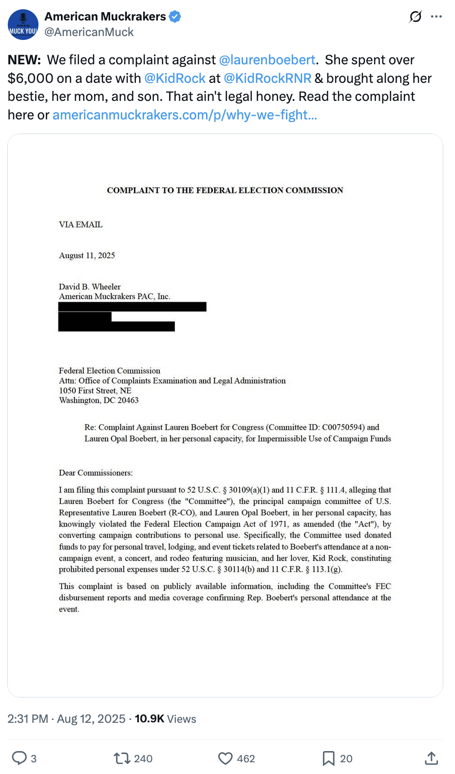 Now Boebert has been caught spending over $6000 in campaign donor money on traveling to and attending a Kid Rock concert in Texas: